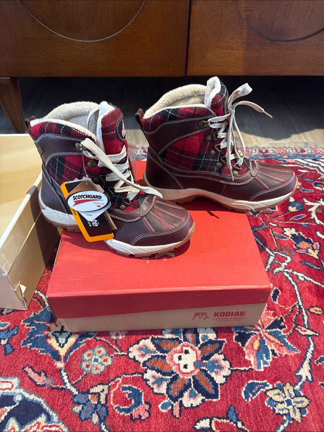 Kodiak Canada's Boot winter boots in a plaid pattern. These boots are perfect for keeping your feet warm and dry during the cold Canadian winters. The boots come with their original box.