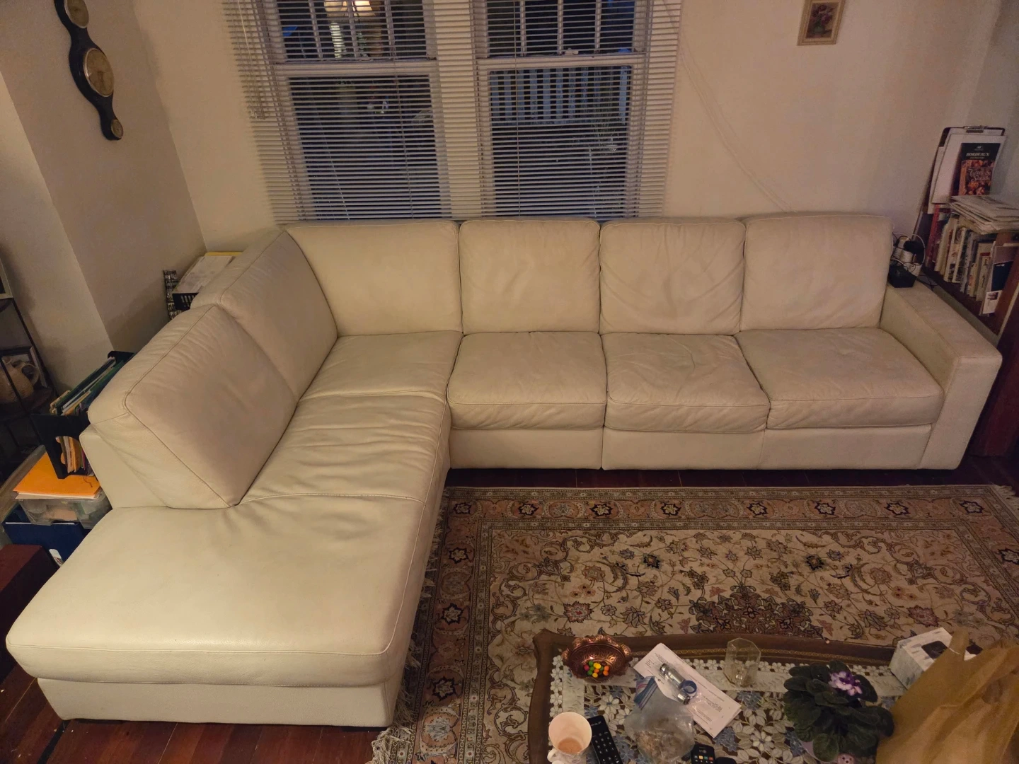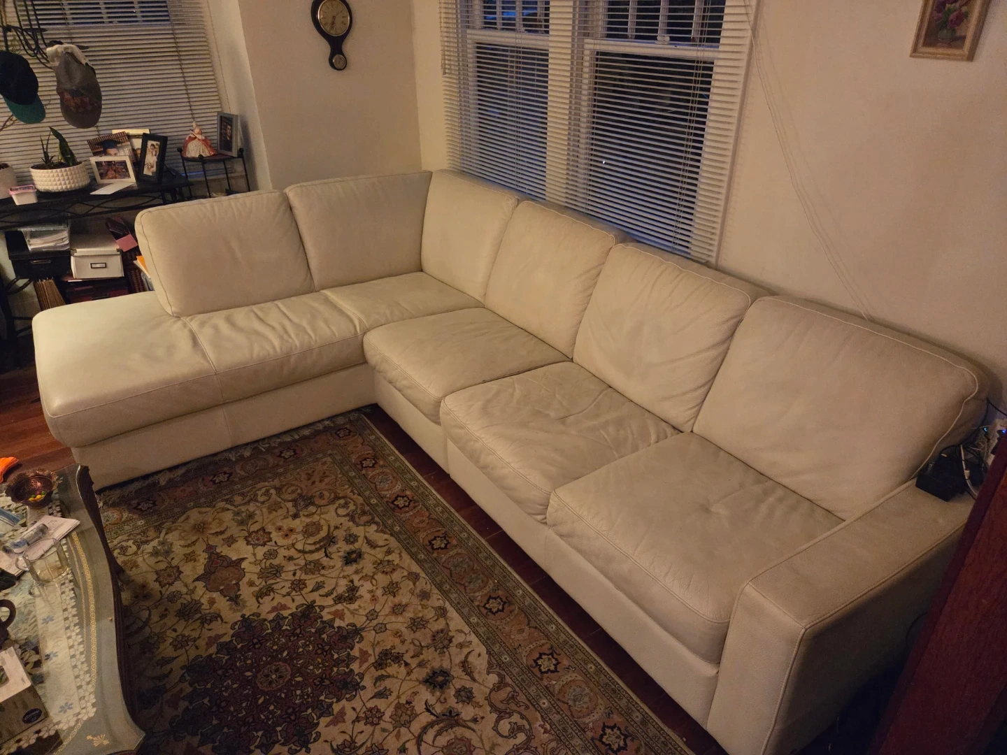 Comfortable sectional sofa upholstered in cream-coloured leather. It's a great piece for a living room or den! Seats multiple people comfortably.