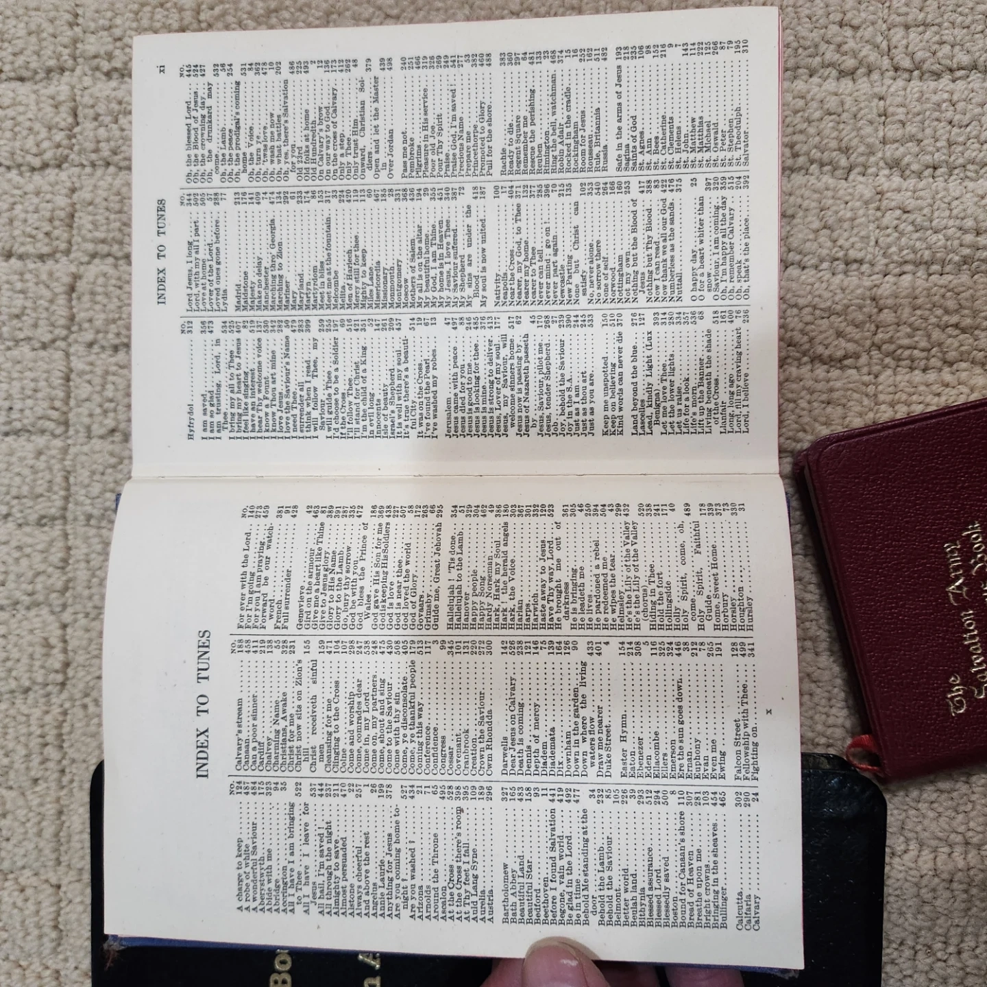 Includes "The Song Book of The Salvation Army", "The Salvation Army Tune Book with Supplement", and a smaller "The Salvation Army Chorus Book". Copyright dates include 1987 for the American Edition of the Song Book. These books are from The Salvation Army organization. Useful for song services and general congregational singing.