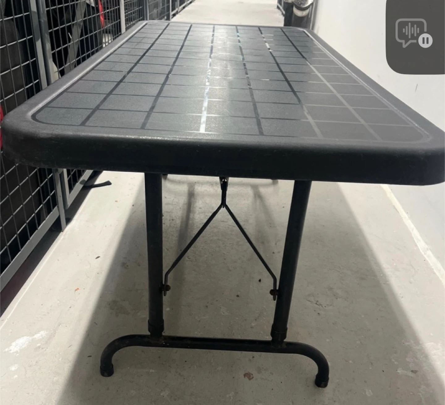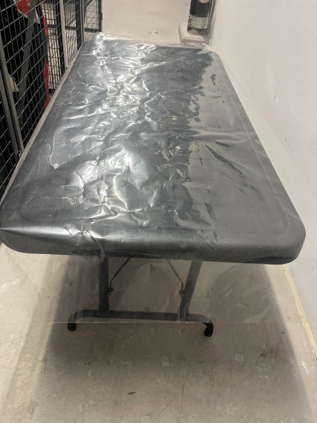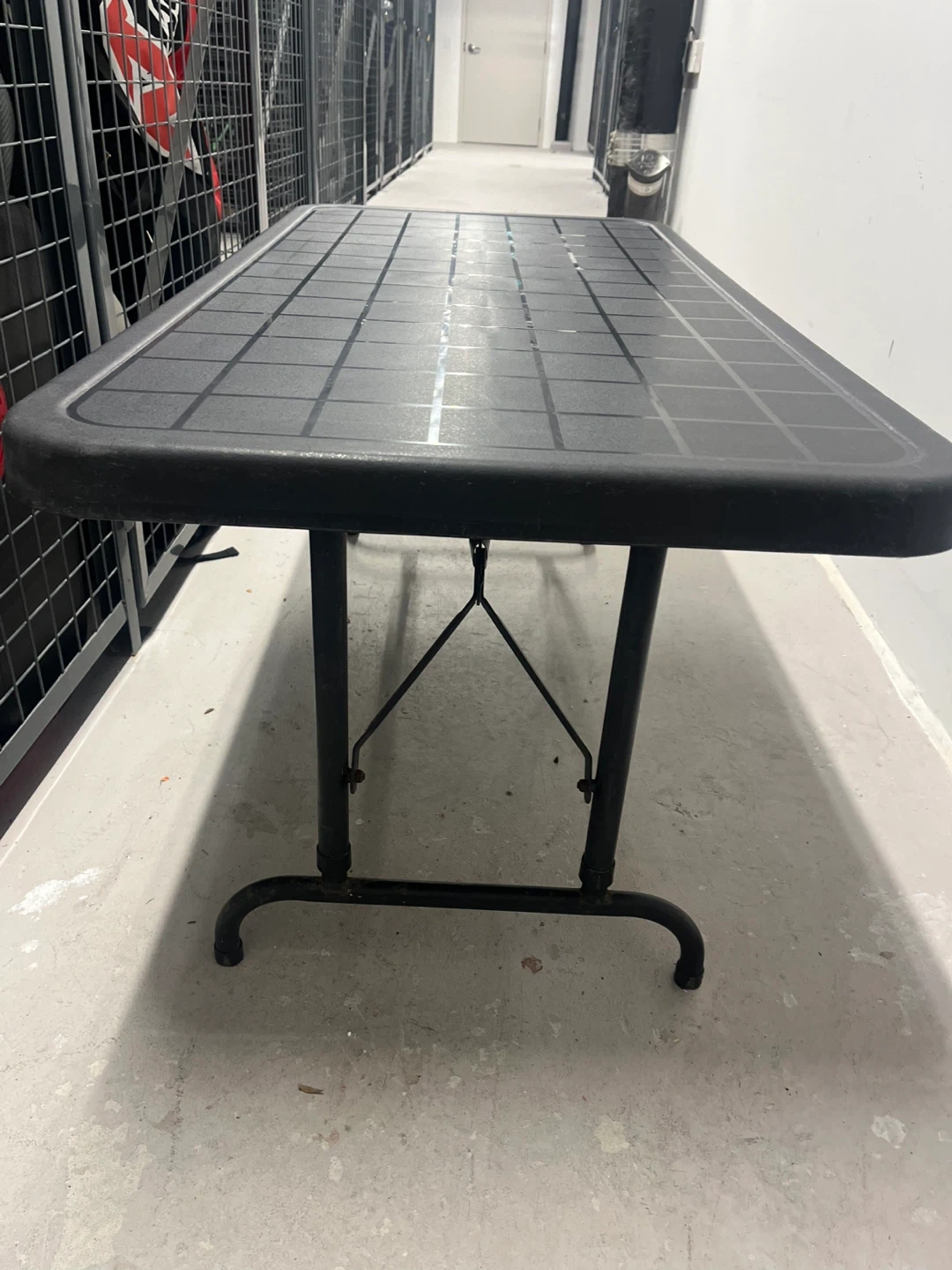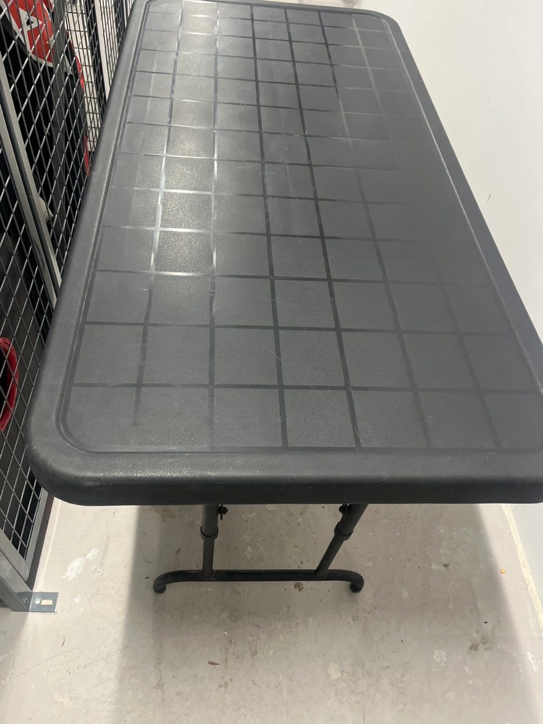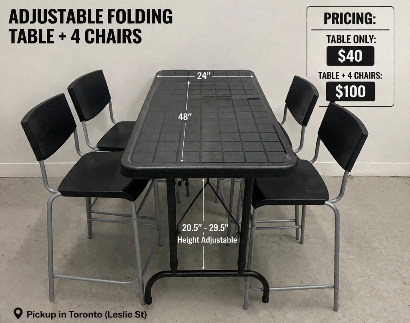 This is an adjustable height folding table, measuring 48 inches by 24 inches. It's black and the height is adjustable from 20.5 to 29.5 inches. It's great for various uses and folds for easy storage!