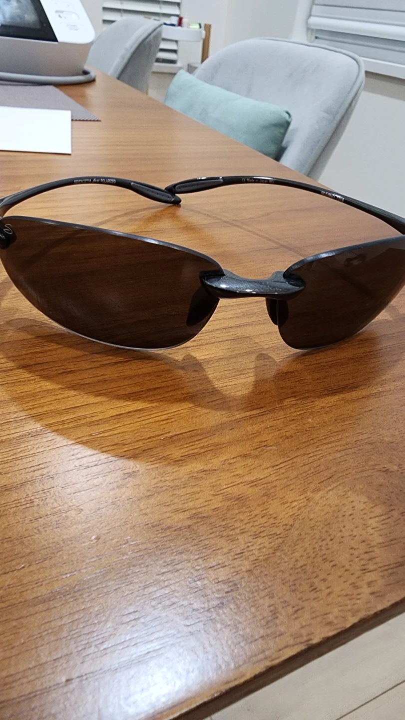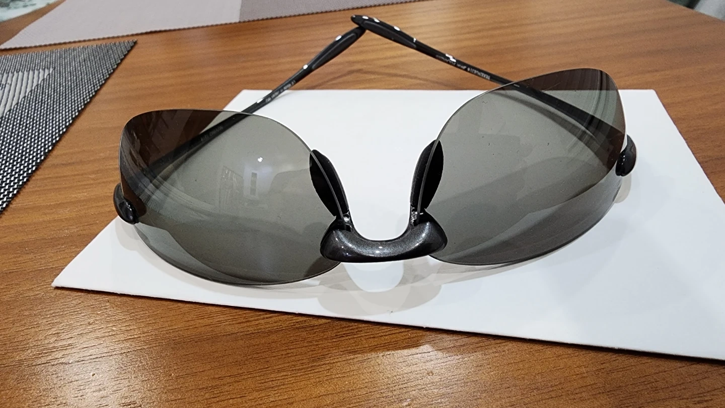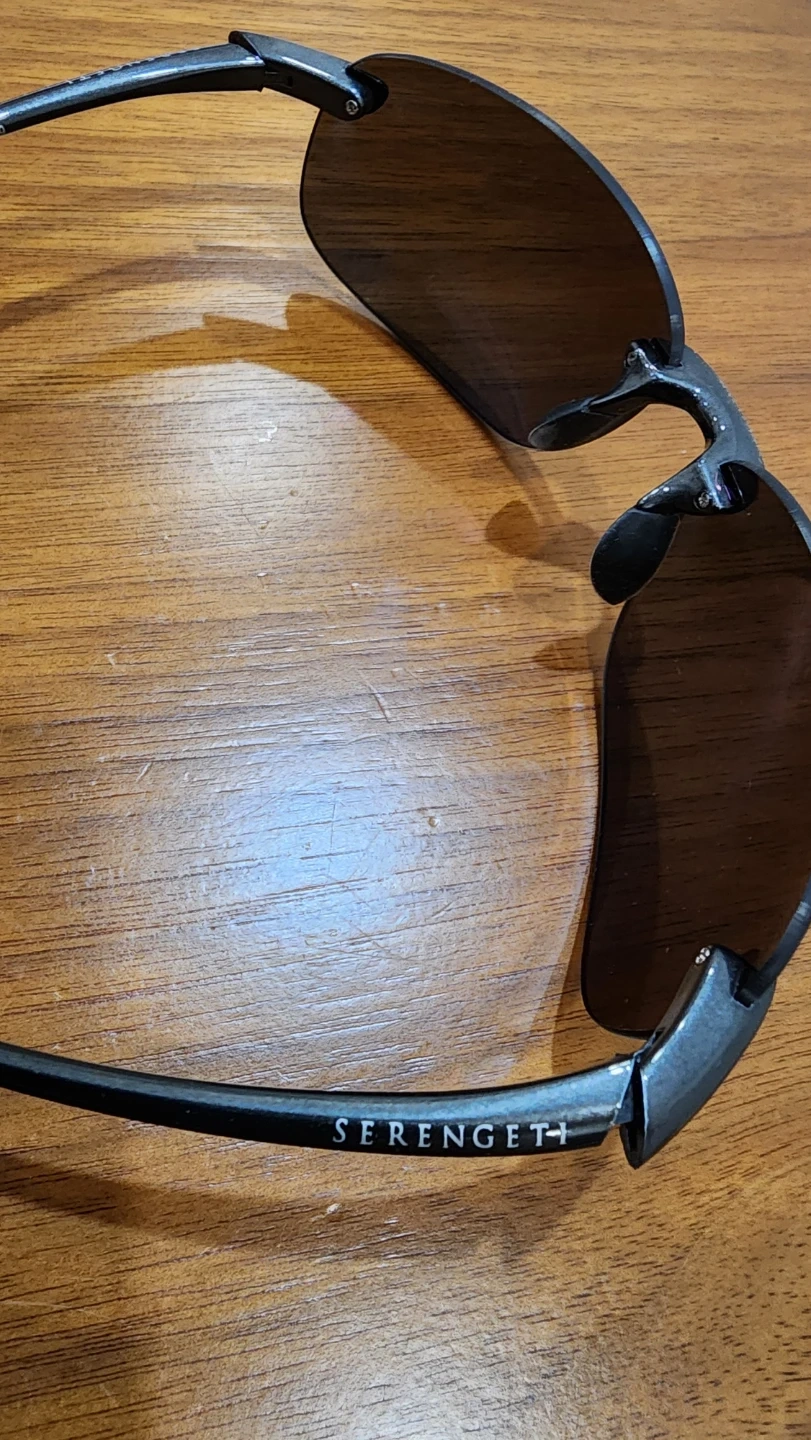 These are Serengeti brand sunglasses with polarized lenses. They're a rimless style with a dark frame. They offer good eye protection.