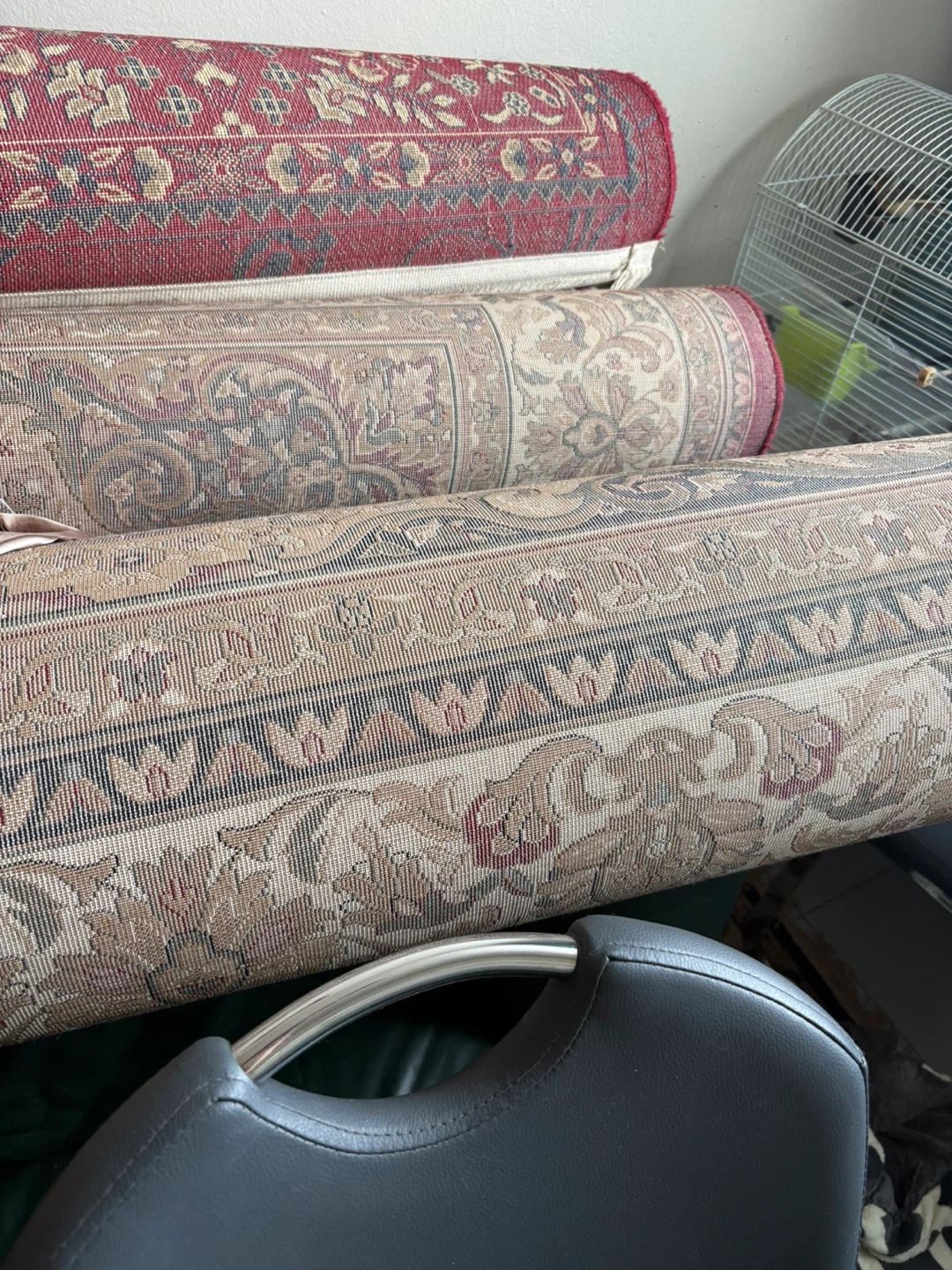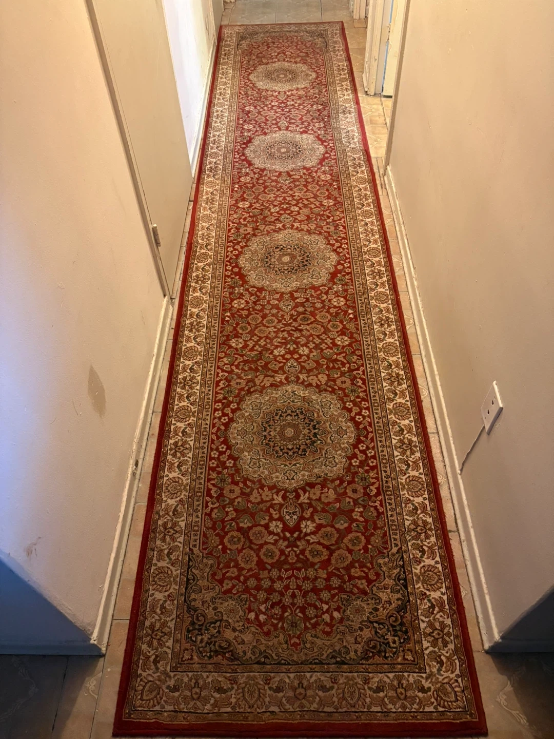 Traditional Persian style area rug with intricate red, cream, and gold detailing. This TIT Collection rug measures 10'X10' and is made of high-quality machine-made carpet. Adds a classic touch to any room!