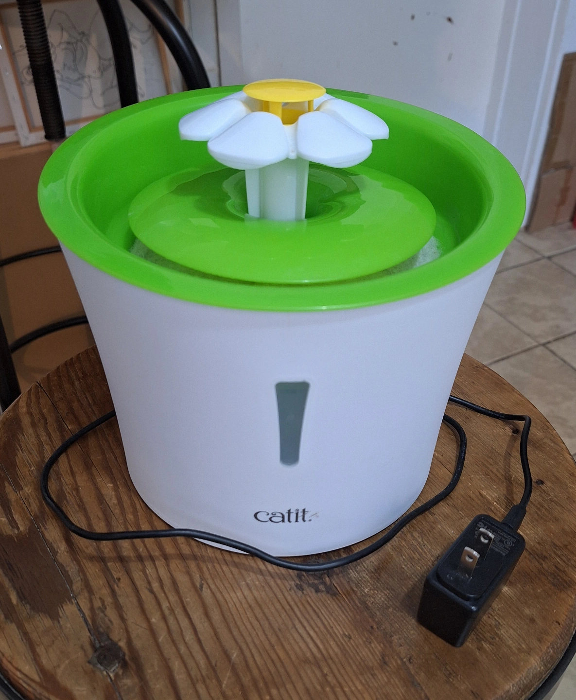 Electric pet fountain with daisy-shaped water feature. ita a good hight for cats or small dogs. All parts included.