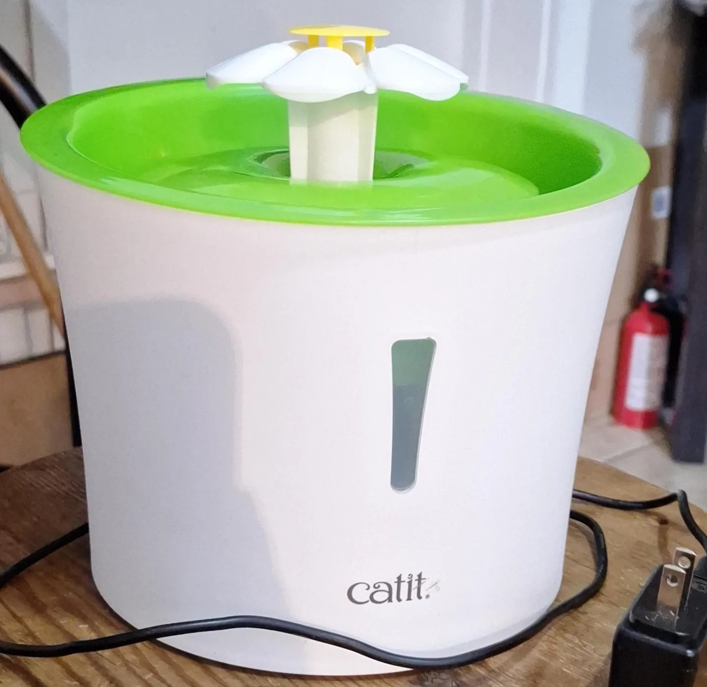 Electric pet fountain with daisy-shaped water feature. ita a good hight for cats or small dogs. All parts included.