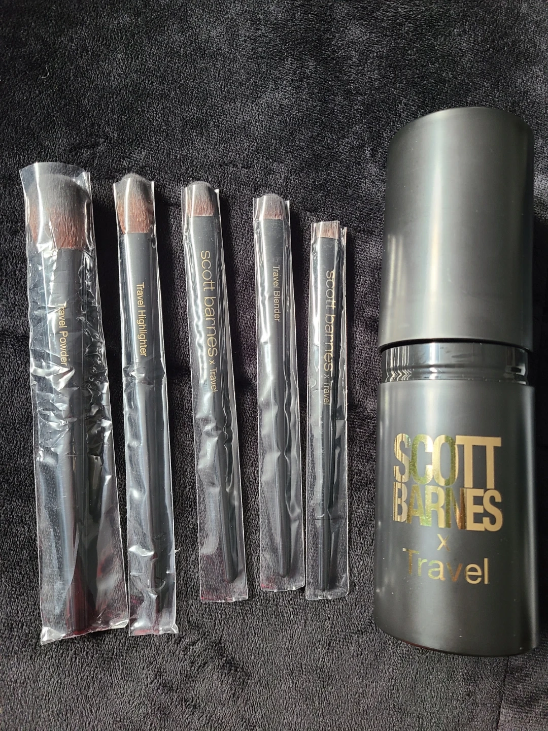 Scott Barnes X Travel brush set. Includes Travel Powder, Travel Highlighter, Travel Color Wash, Travel Blender, and Travel Angled Smudge brushes.