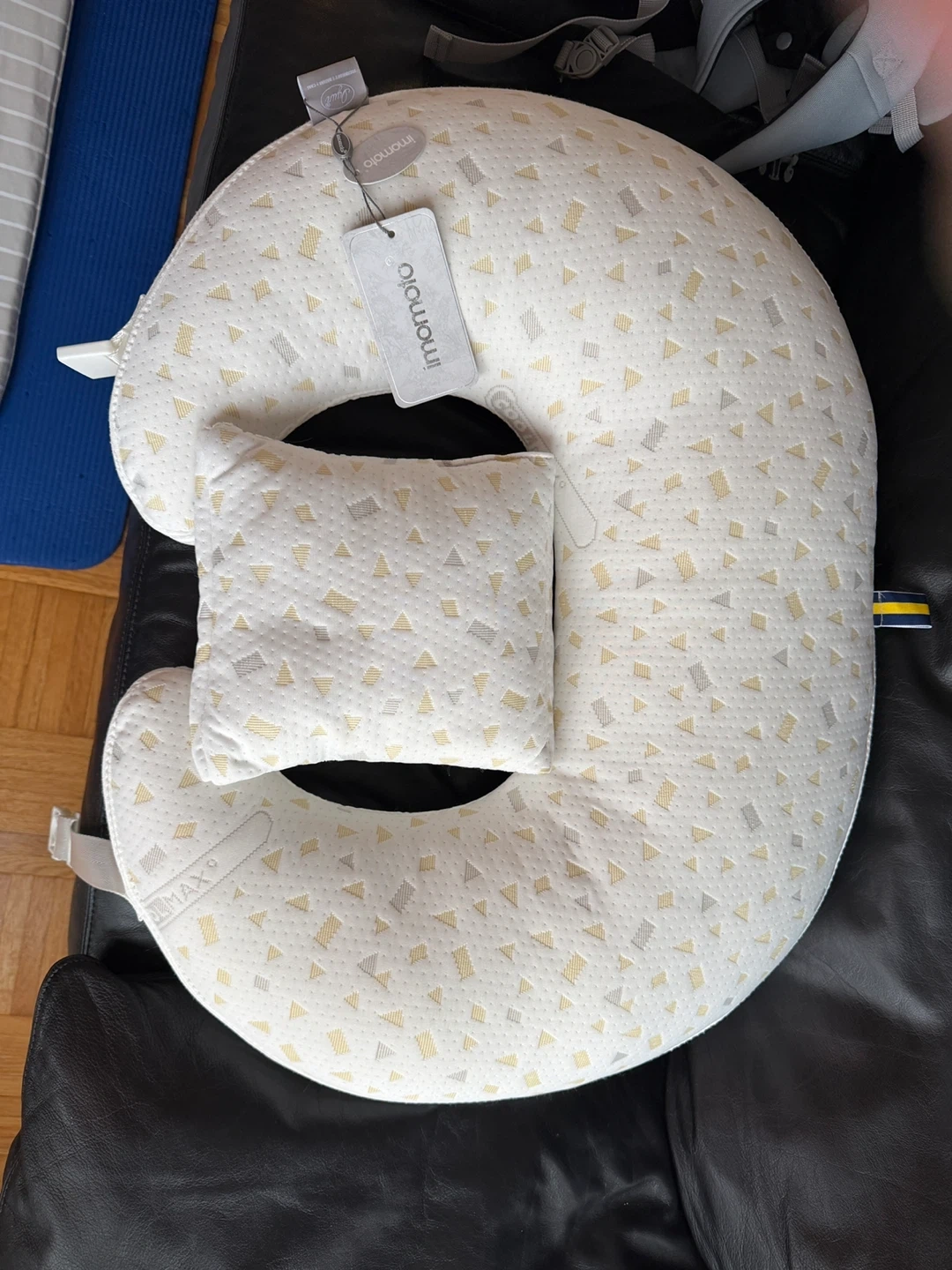 This nursing pillow comes with a smaller coordinating pillow. It's designed to support you and your baby during feeding. The cover features a geometric triangle pattern in white, yellow, and grey.
