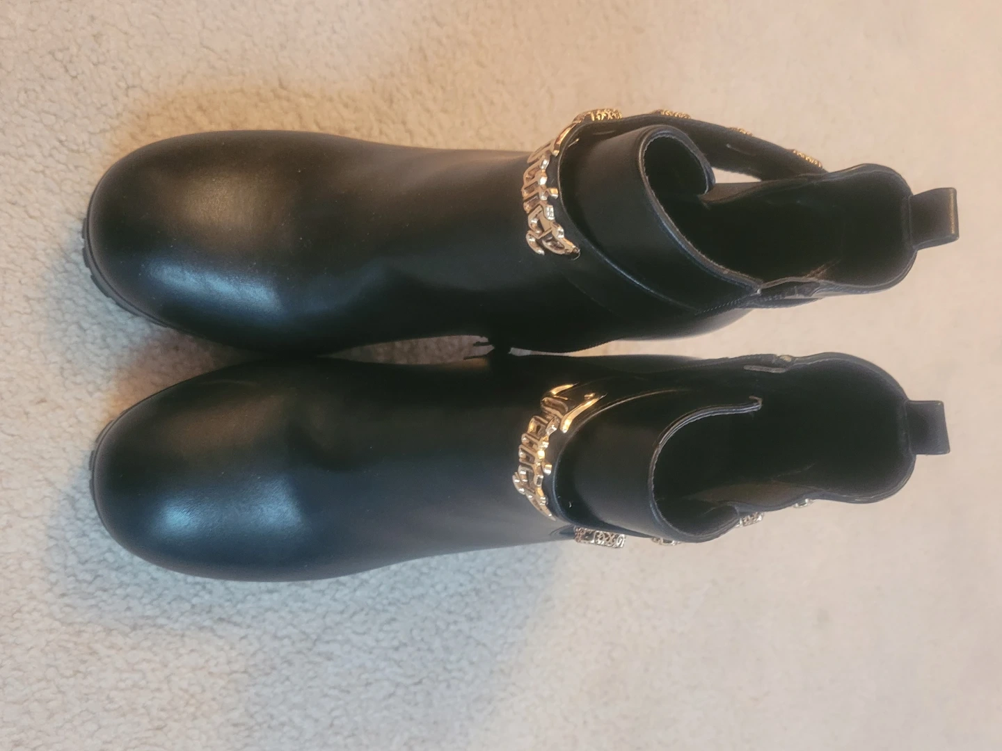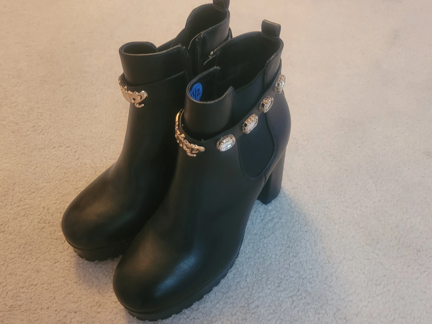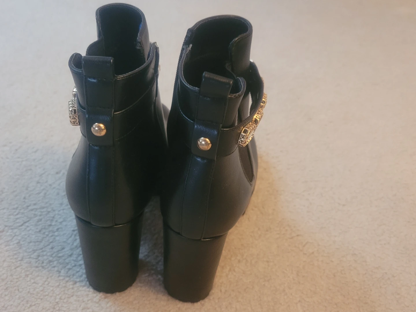 Black faux leather ankle boots featuring a decorative gold chain and crystal embellishment around the ankle. Side zipper closure with elastic gore for easy wear. Chunky block heel and platform sole.