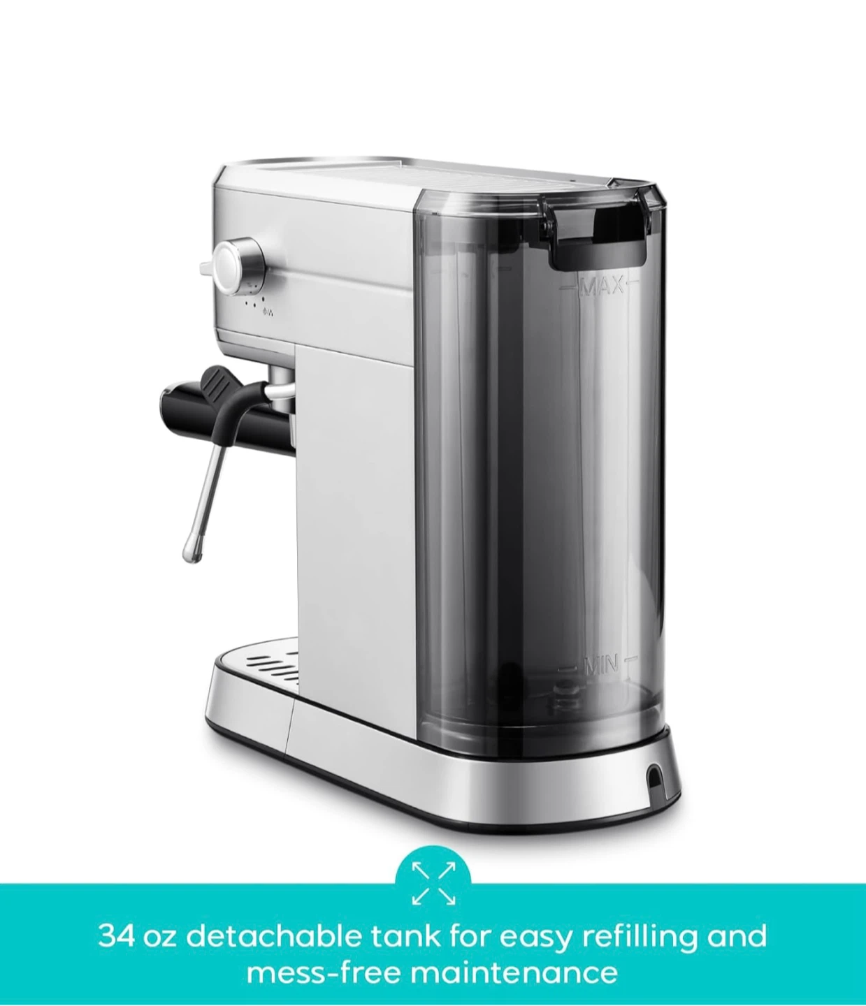 Make perfect espresso every time with 20 Bar pressure. It features a powerful steam wand for creamy latte and cappuccino froth. The built-in cup warmer keeps coffee hot from the first sip to the last. This machine has a 34 oz detachable tank for easy refilling and mess-free maintenance. New Sealed Condition.