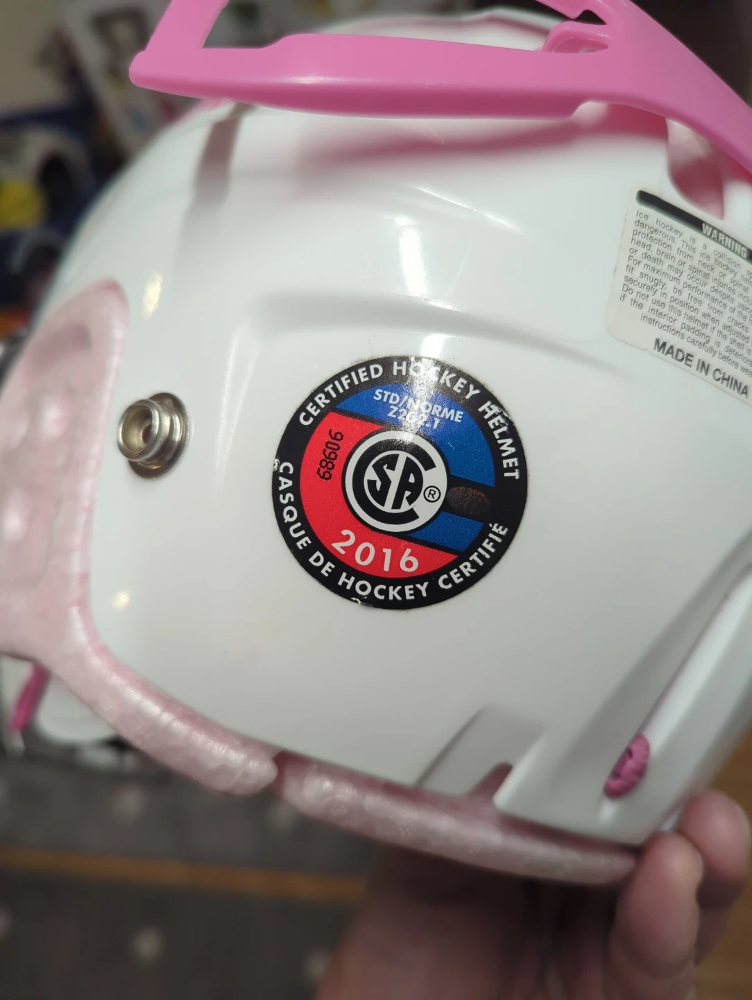 Bauer Lil' Sport youth hockey helmet in white with pink accents. Size is 6-6¾ (48.5-54 cm). Certified hockey helmet.
