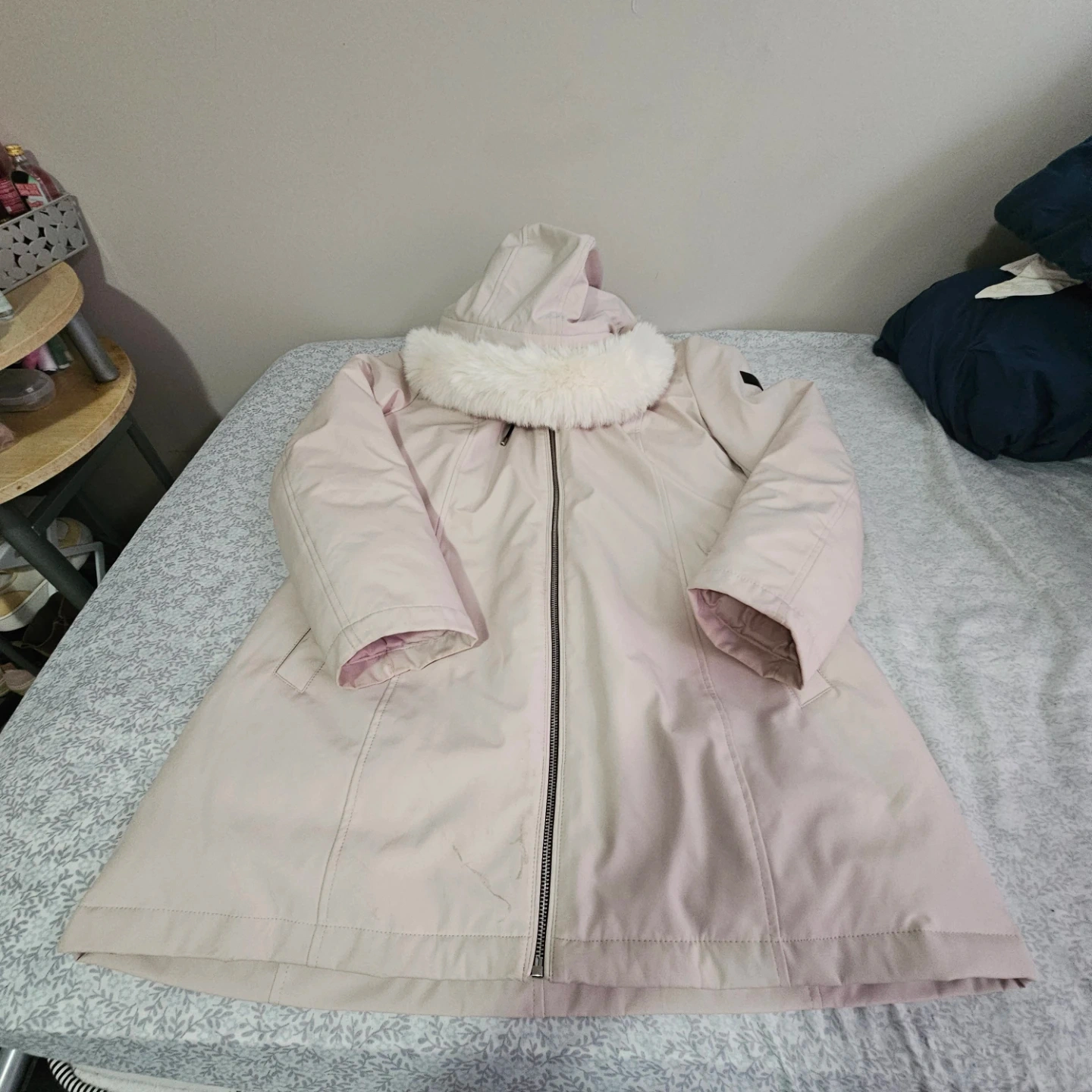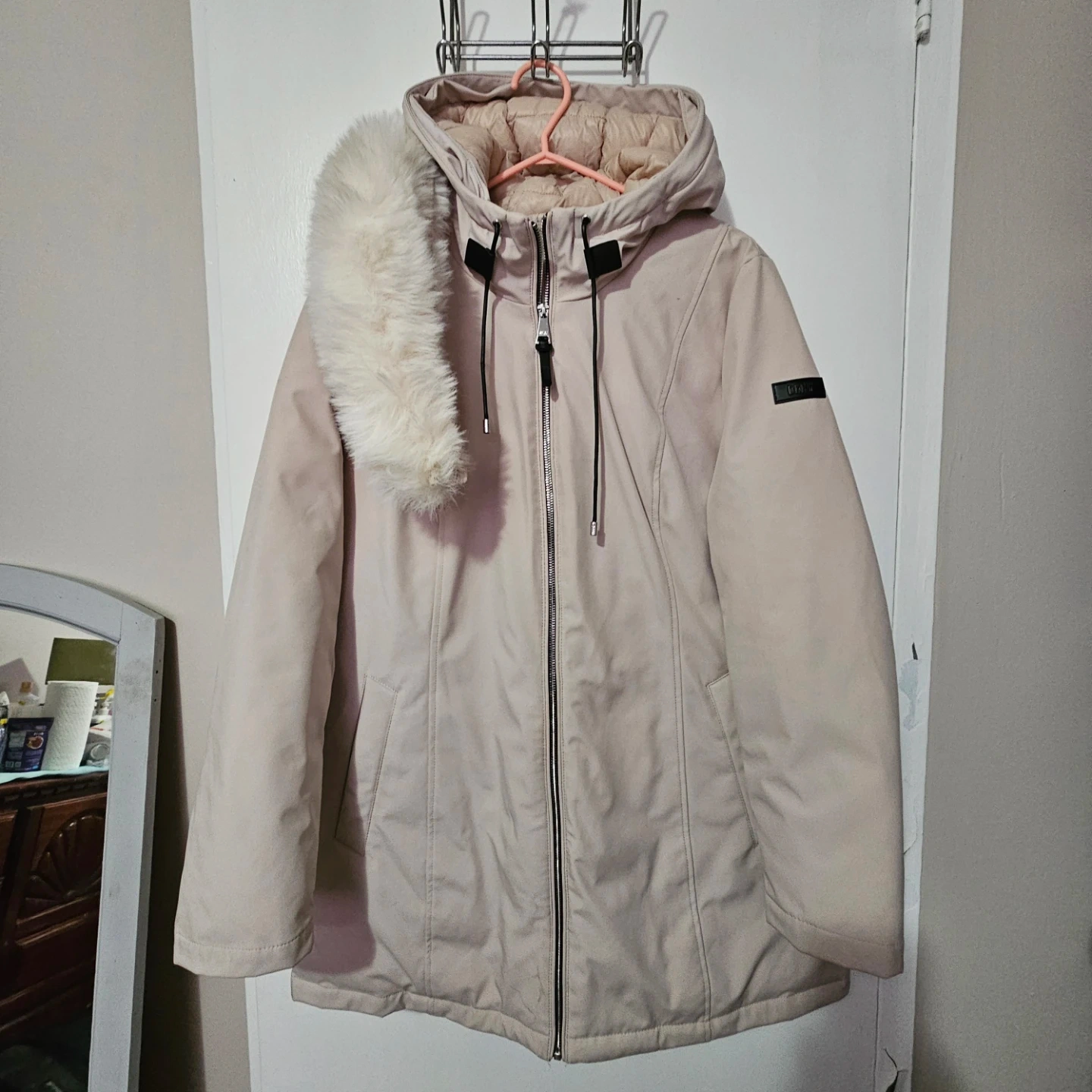 DKNY parka coat in beige. It's a size large with a detachable faux fur trim. This coat features a zippered closure and a hood.