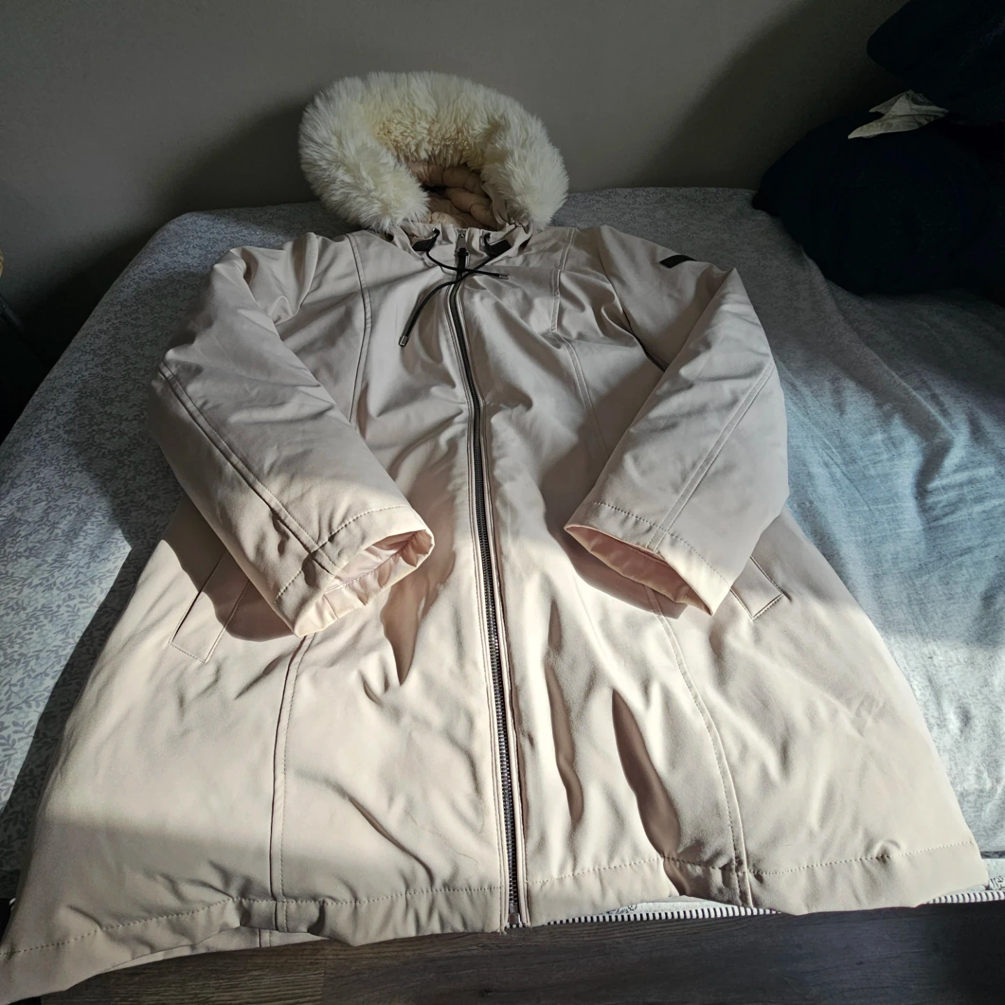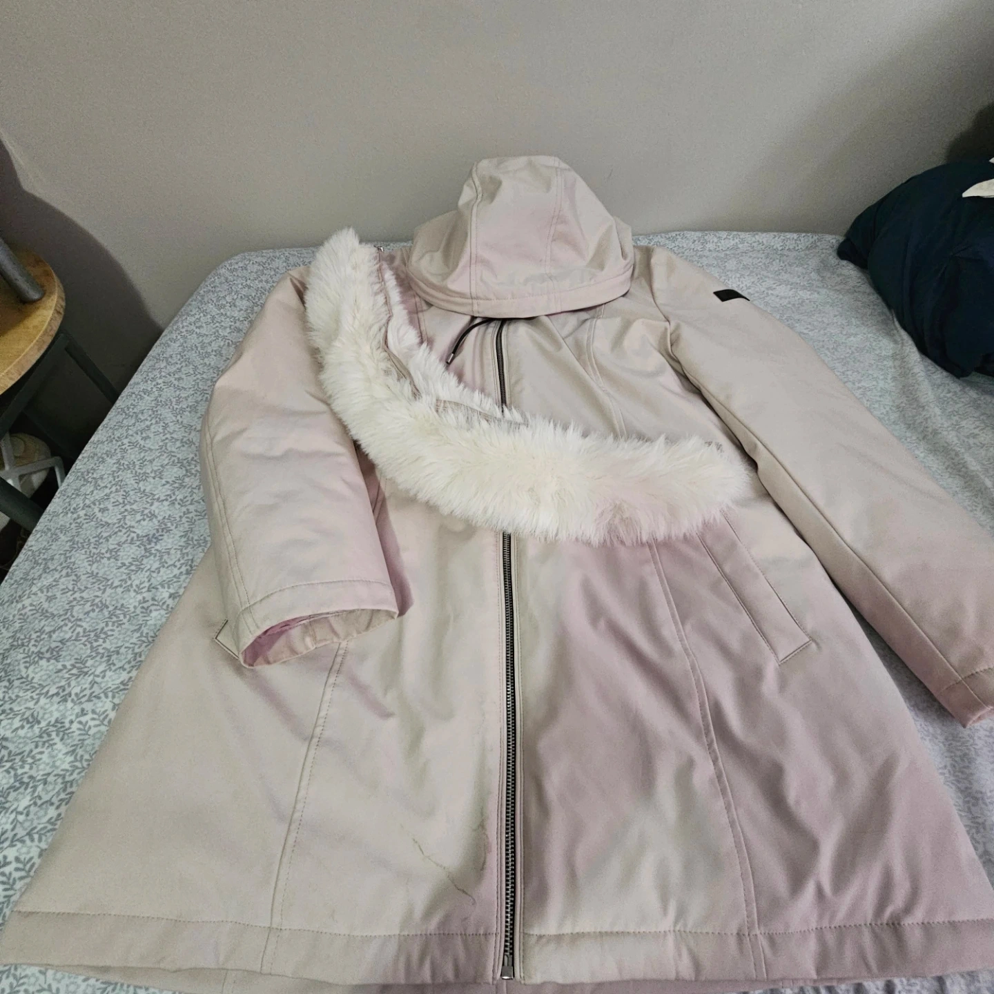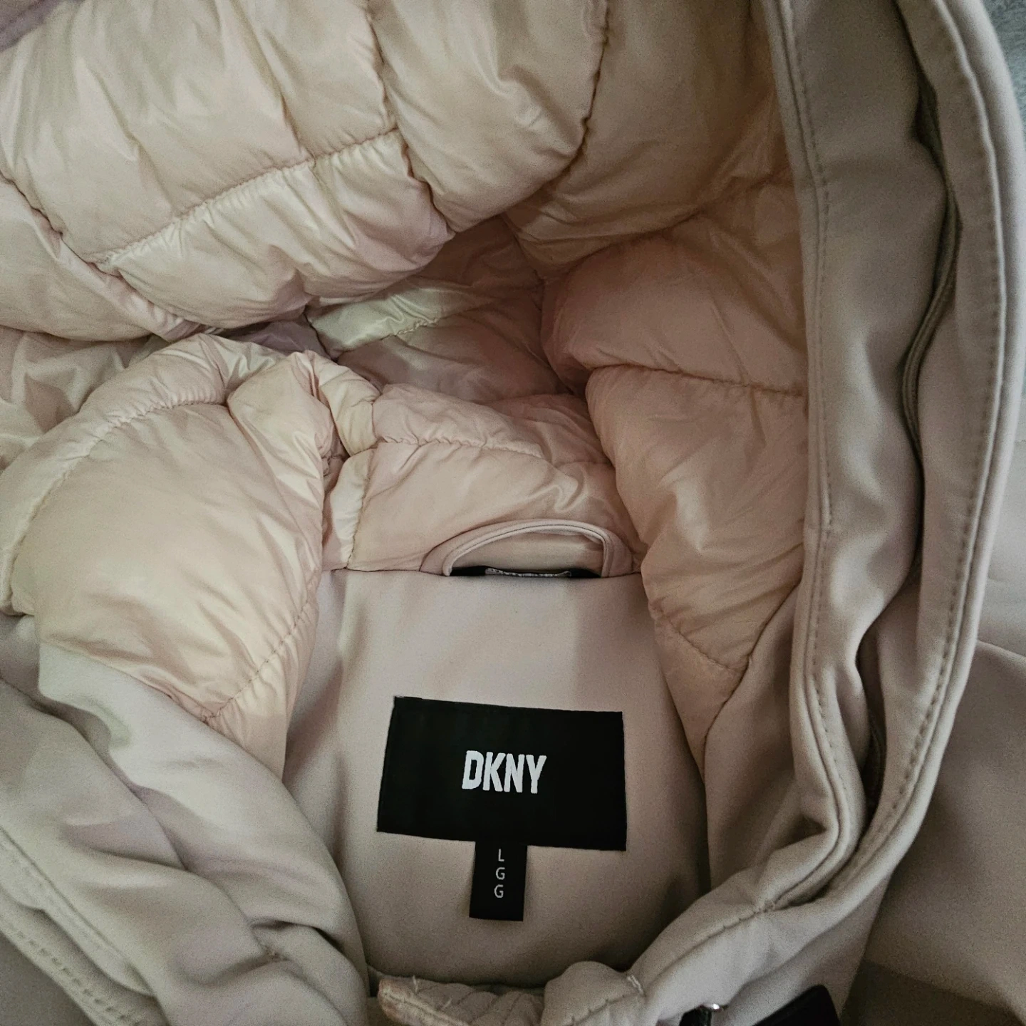 DKNY parka coat in beige. It's a size large with a detachable faux fur trim. This coat features a zippered closure and a hood.