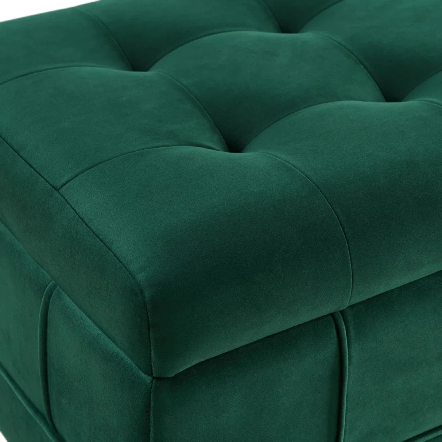 Moving out sale - Deep green velvet tufted storage bench with wooden legs. It's perfect for storing blankets, pillows, or other household items. The bench opens to reveal ample storage space inside.