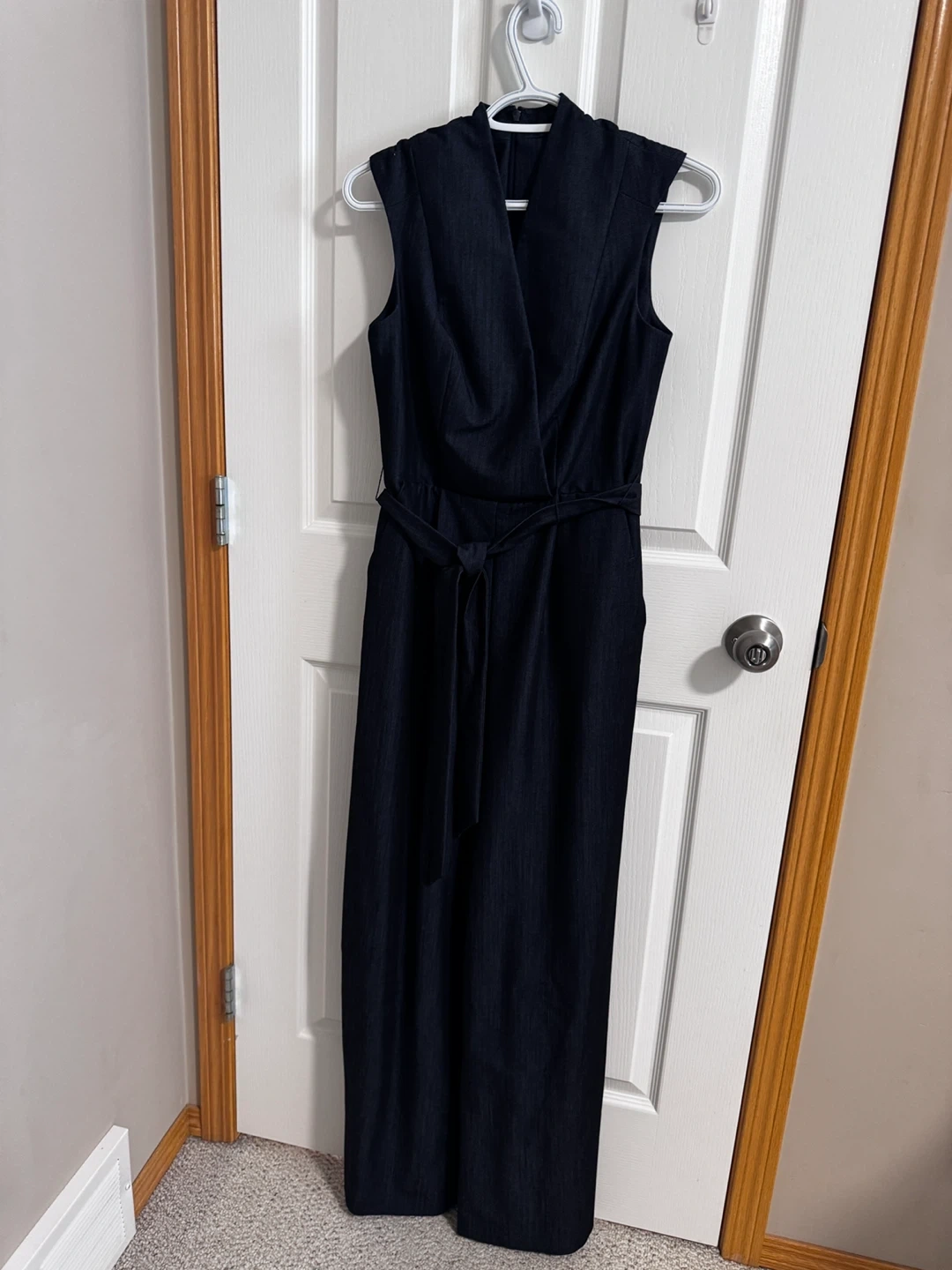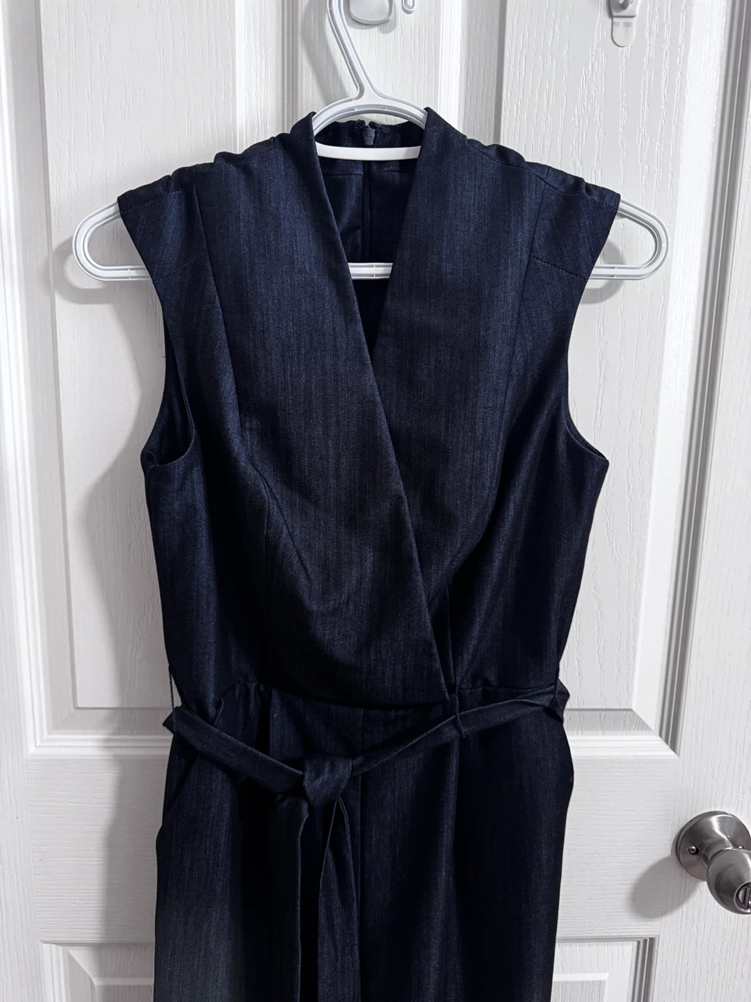 This dark blue jumpsuit features a wrap-style V-neck and a tie belt at the waist. It's sleeveless with a wide-leg silhouette. Made from a denim-like fabric, it offers a stylish yet comfortable option. Only wear once.