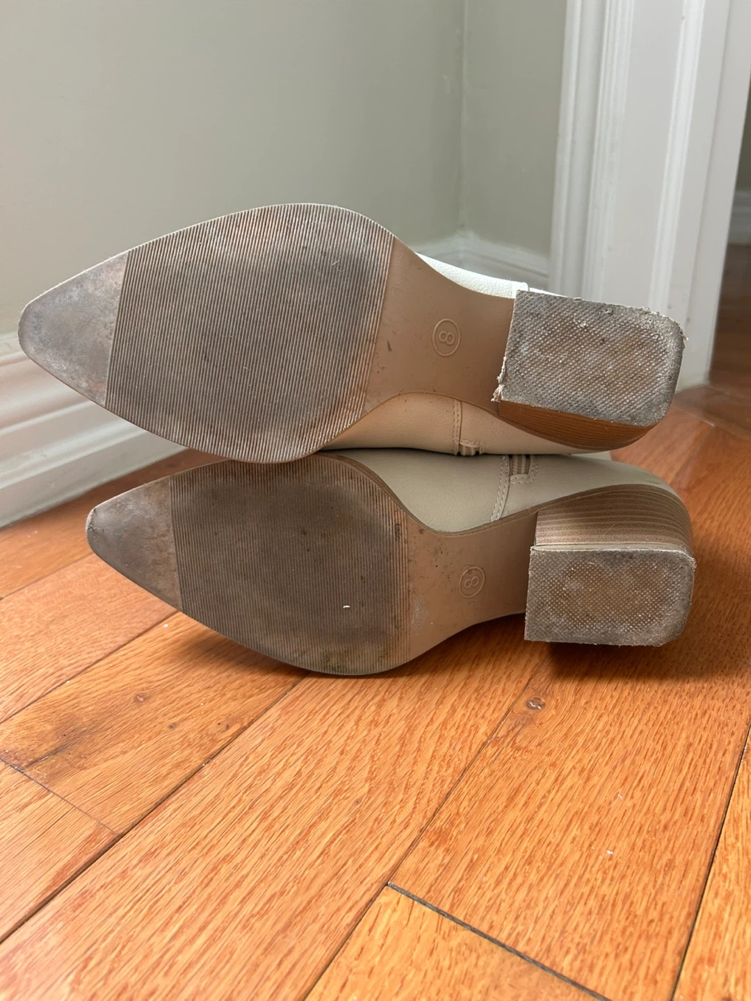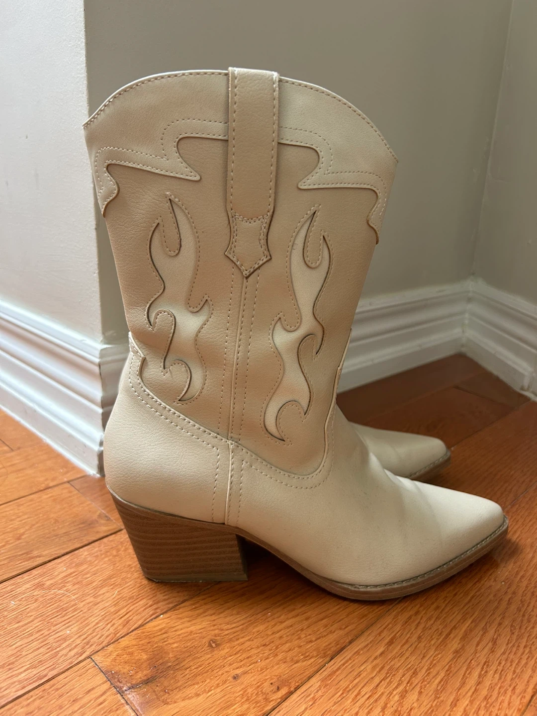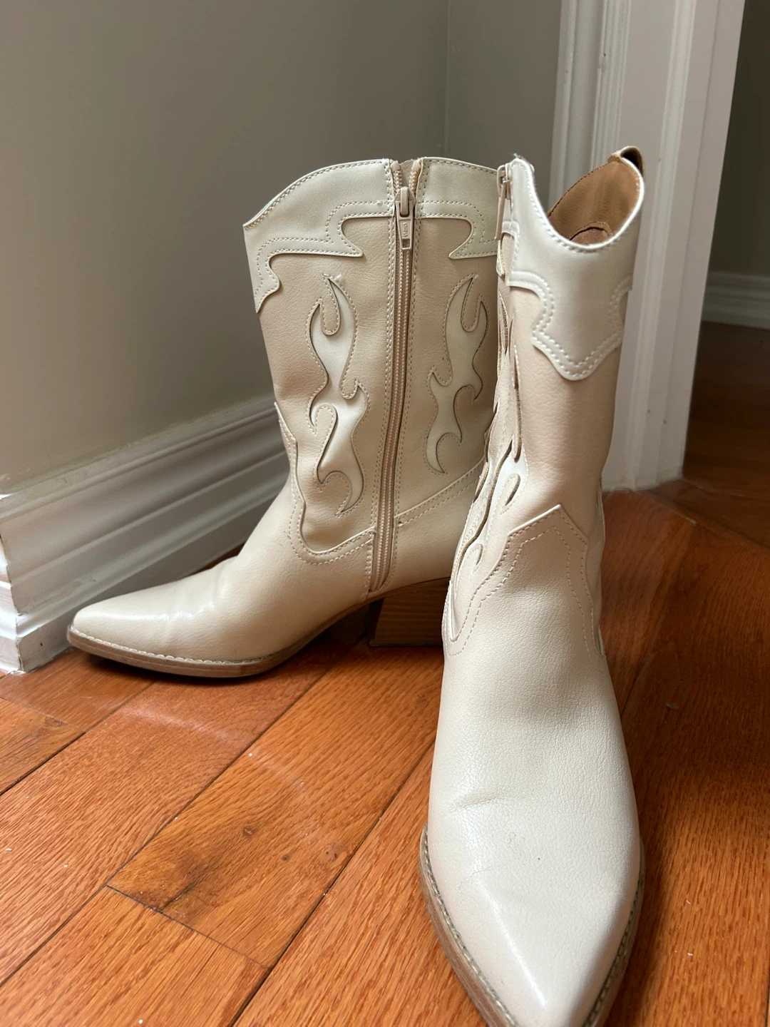 Stylish cream white western cowboy boots with a pointed toe and a comfortable block heel. Side zipper for easy on and off. Made of faux leather material. Size 8.