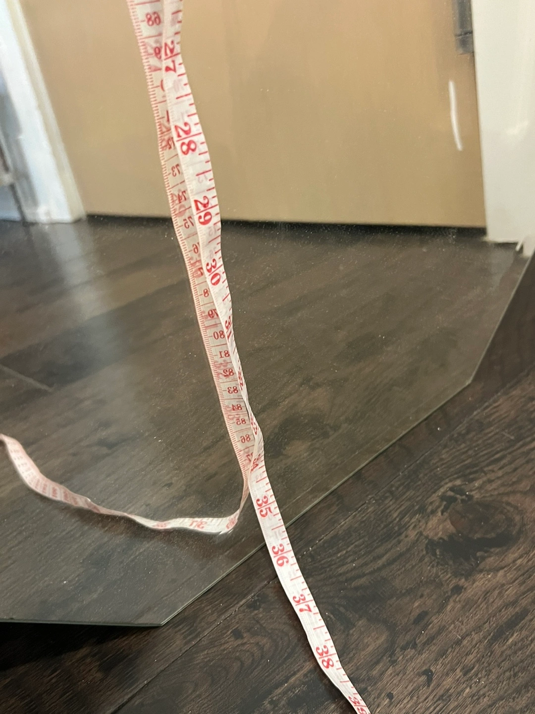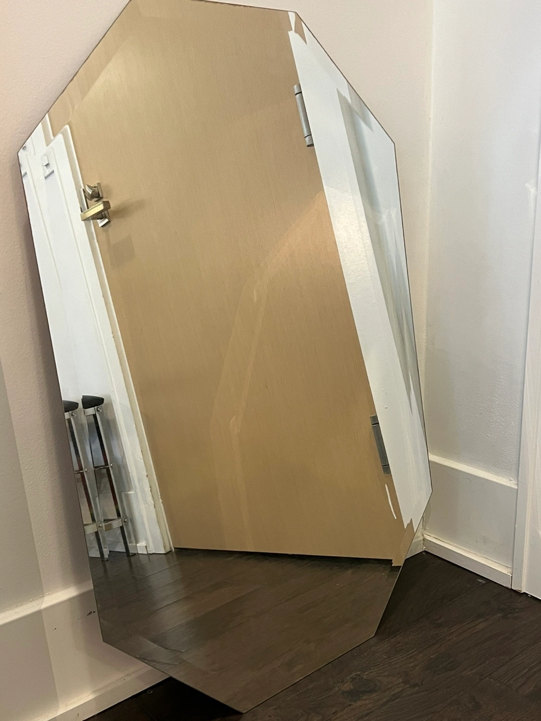 This is a cool hexagonal mirror with a unique shape. It's made of glass and would add a stylish touch to any room! It measures about 36 inches tall on the longest side.