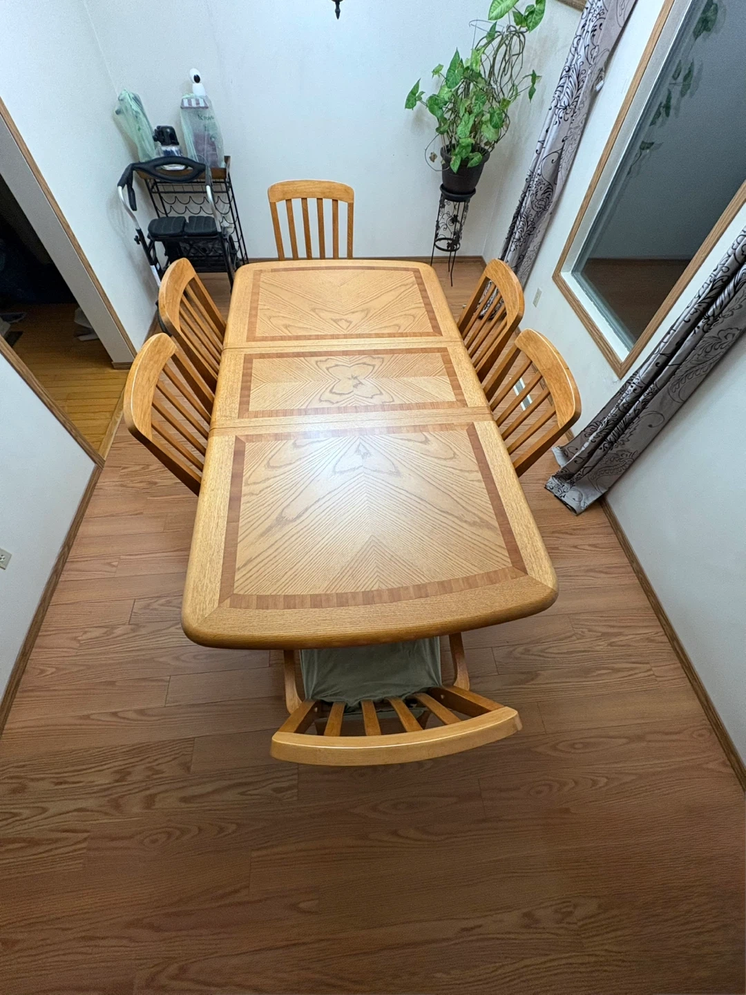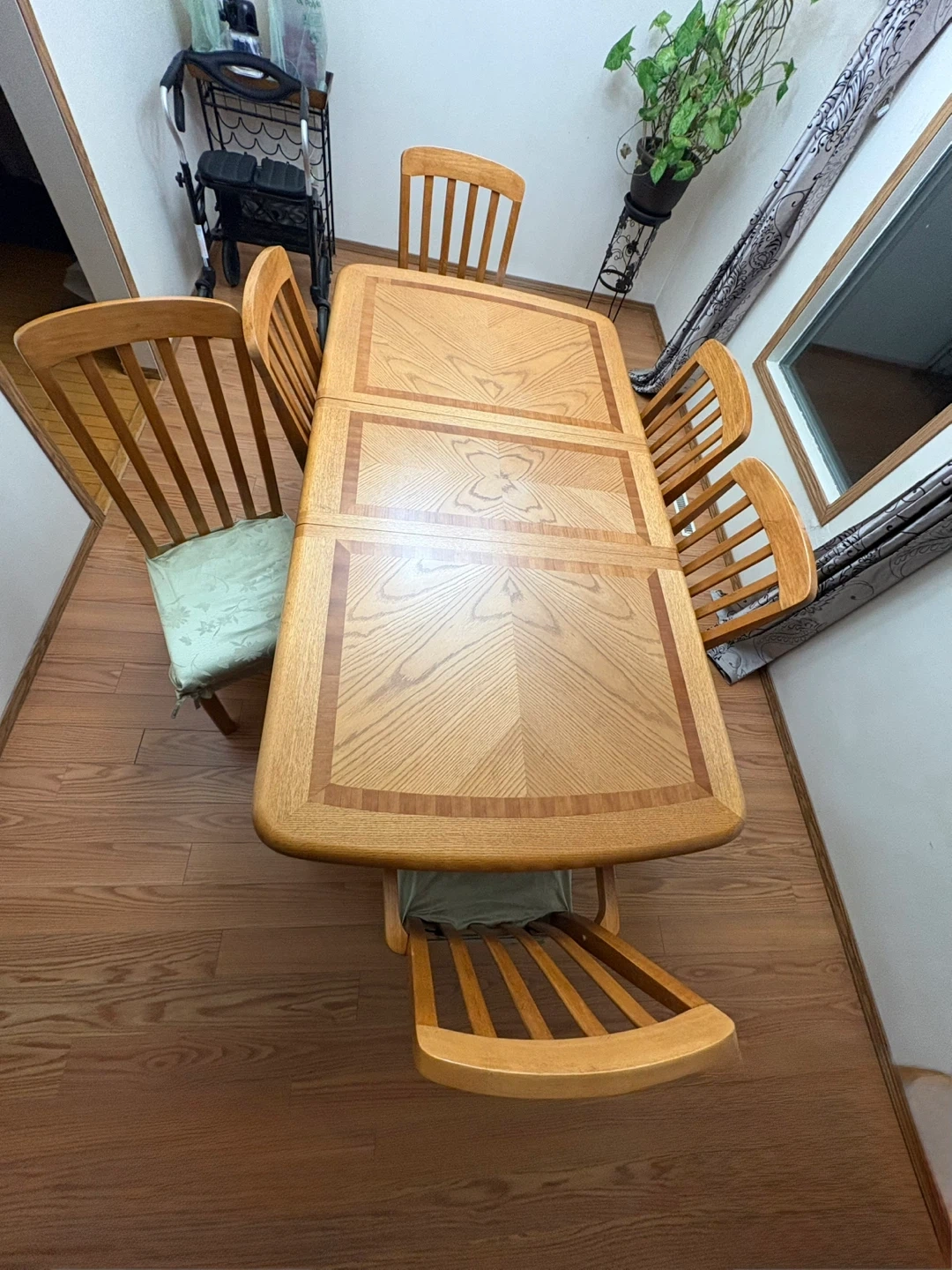 This is a lovely wooden dining table with six matching chairs. The table has a beautiful inlaid wood design. It's approximately 78 inches long and 40 inches wide. It's perfect for family dinners or entertaining guests! Chair covers are free, Pick up only south side location. DM for more info