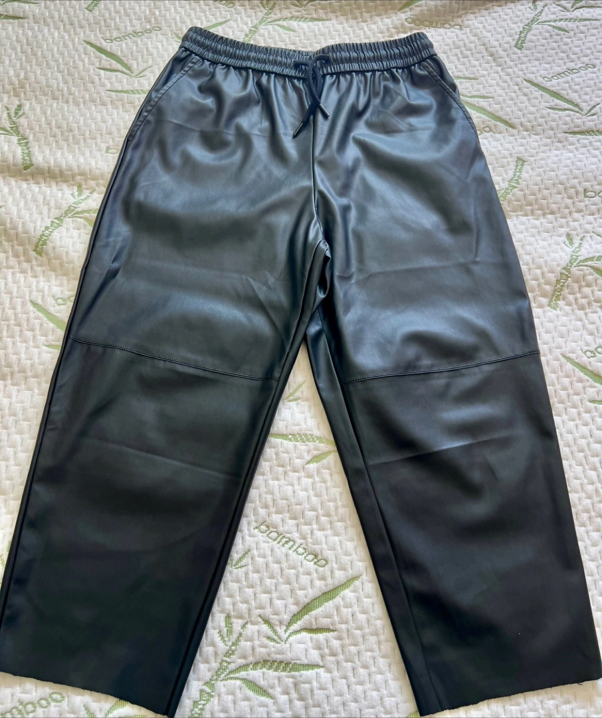 Faux leather pants. Elastic waistband with drawstring. Wide leg style. Consider wearing these pants for a relaxing evening at home.