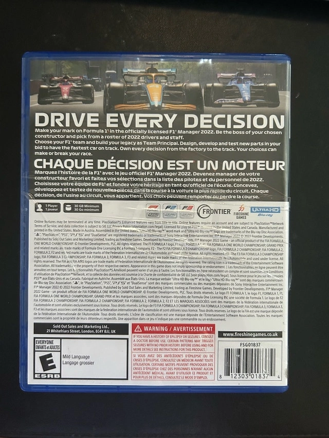Become the team principal in F1 Manager 22 for Playstation 5! This disc is in like-new condition and will let you make your mark on Formula 1. Drive every decision, from choosing your F1 team to building and testing new parts. Can you lead your team to victory? Make your mark on Formula 1® in the officially licensed F1® Manager 22.