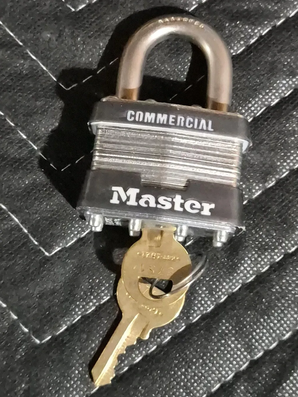 Master Lock commercial padlock. It's a durable lock with a metal body and shackle. Includes two keys for access. Good for securing sheds or storage units.