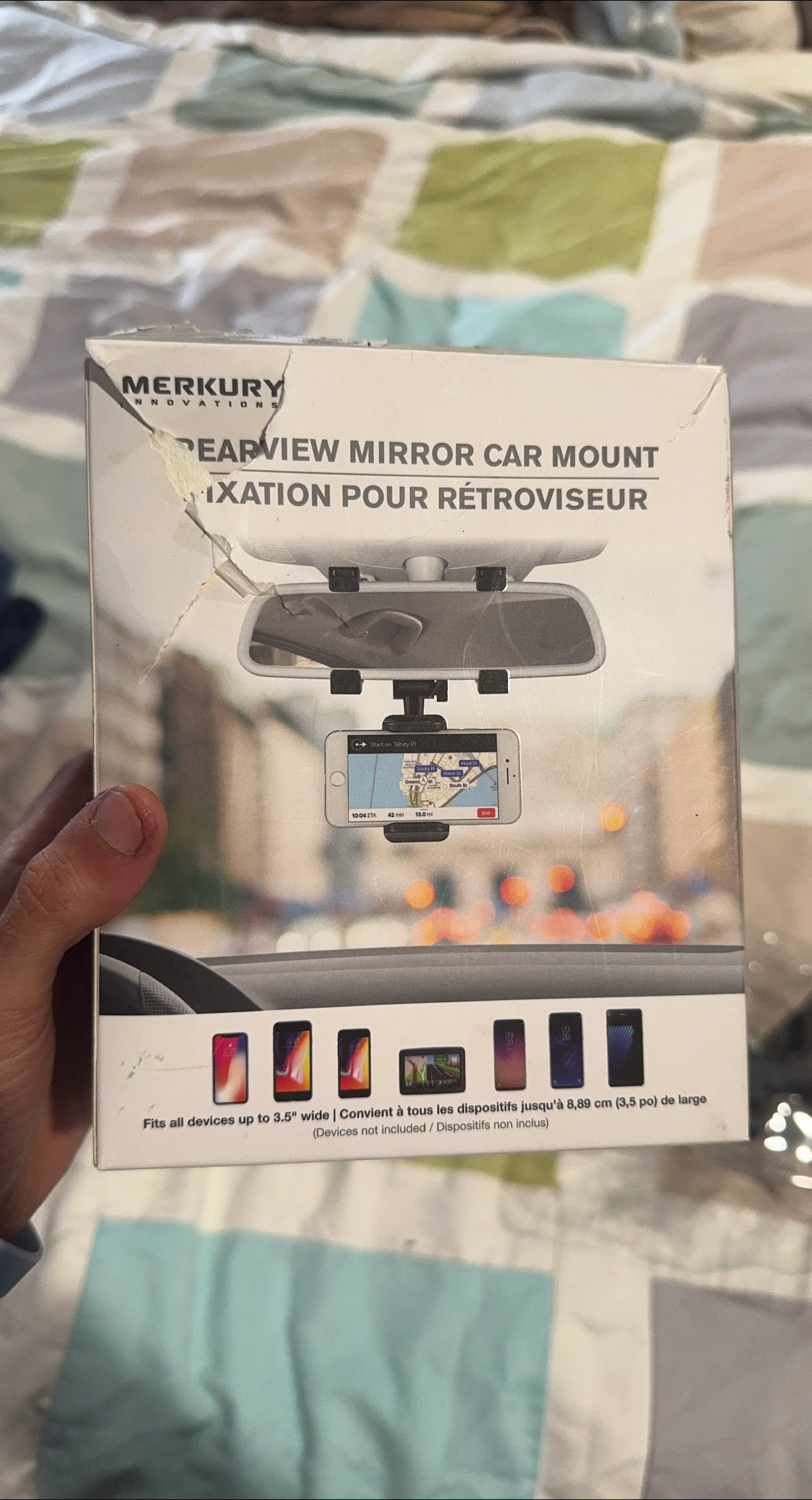 This is a rearview mirror car mount from Merkury Innovations. It fits devices up to 3.5 inches wide. Mount your phone for easy navigation while driving!