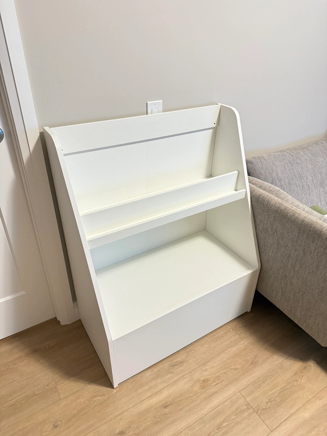 Selling a simple white bookshelf. It's in great condition and perfect for a kid's room or any space needing some extra storage! It has a clean and minimalist design, so it fits in with any decor.
