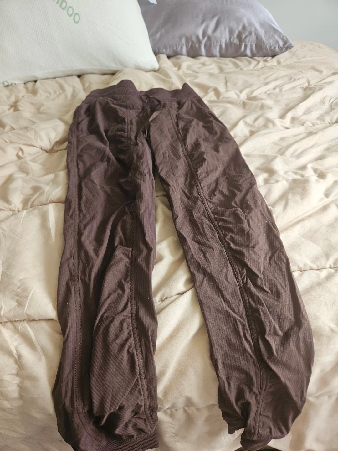 Brown Lululemon midrise joggers. Drawstring waist for adjustability. These pants are made from a lightweight, breathable fabric.