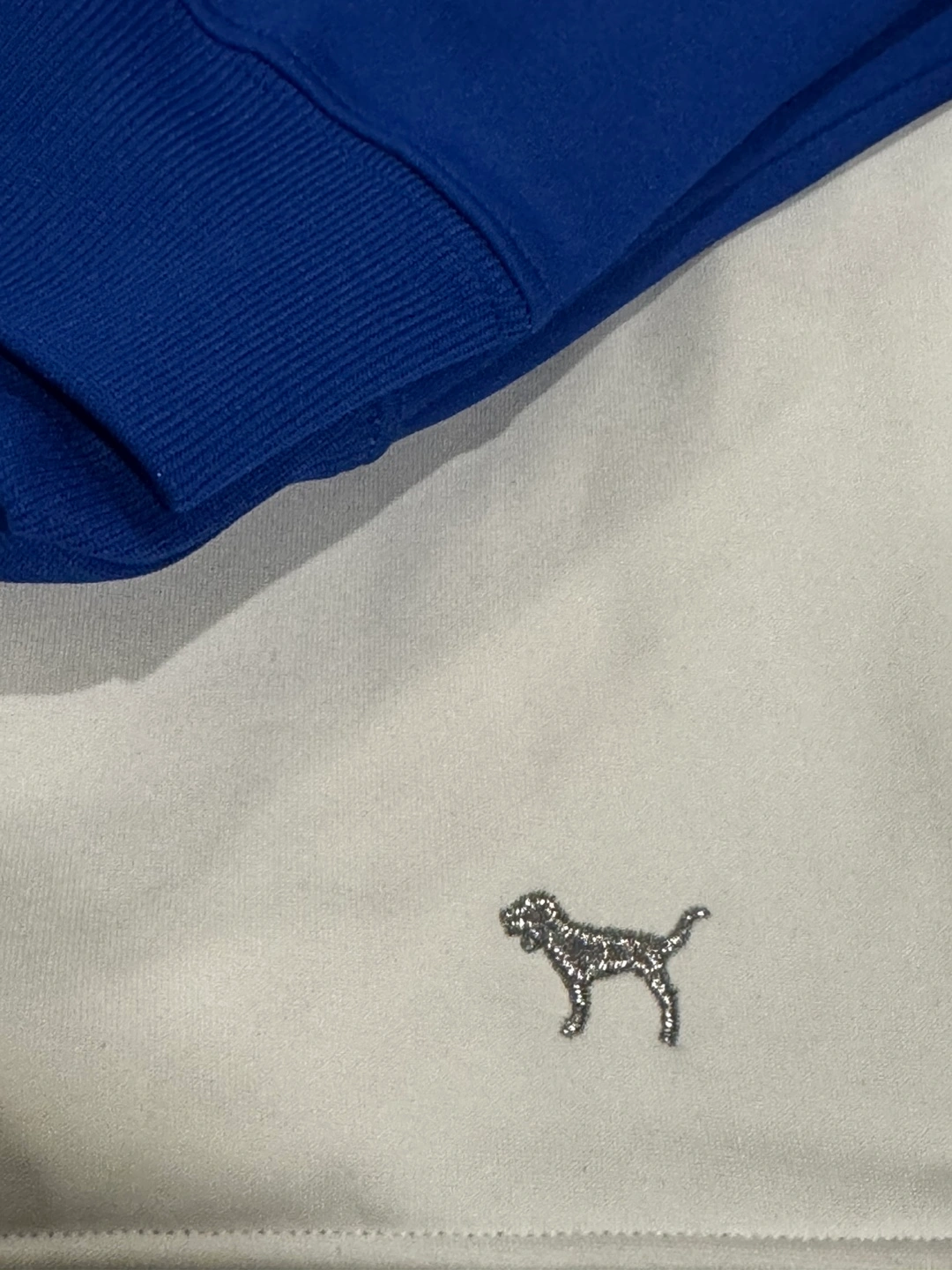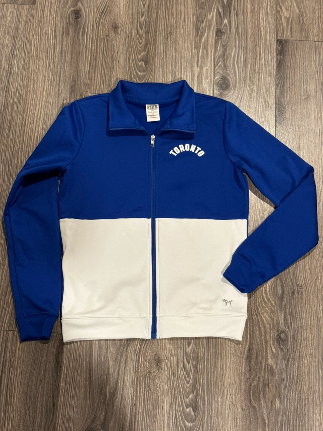 Features a blue and white colour block design. Toronto lettering on the front and Blue Jays logo on the back.