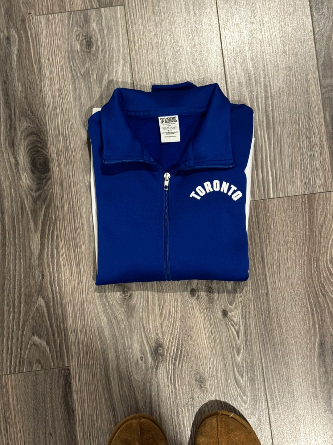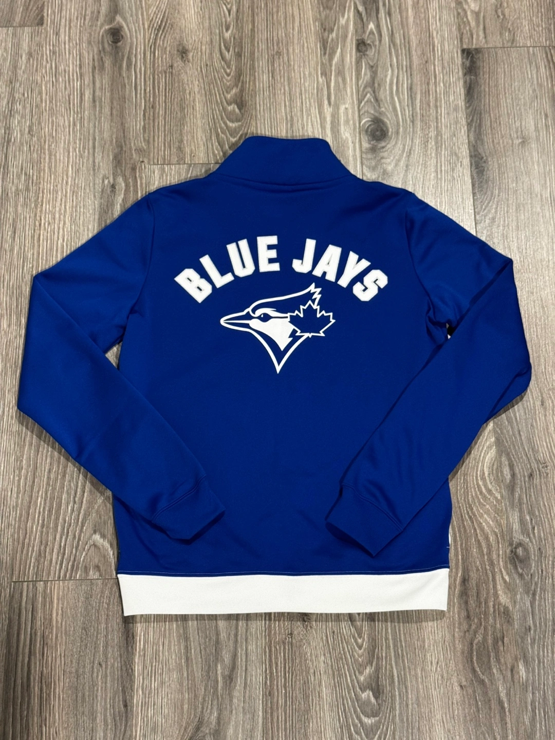 Features a blue and white colour block design. Toronto lettering on the front and Blue Jays logo on the back.