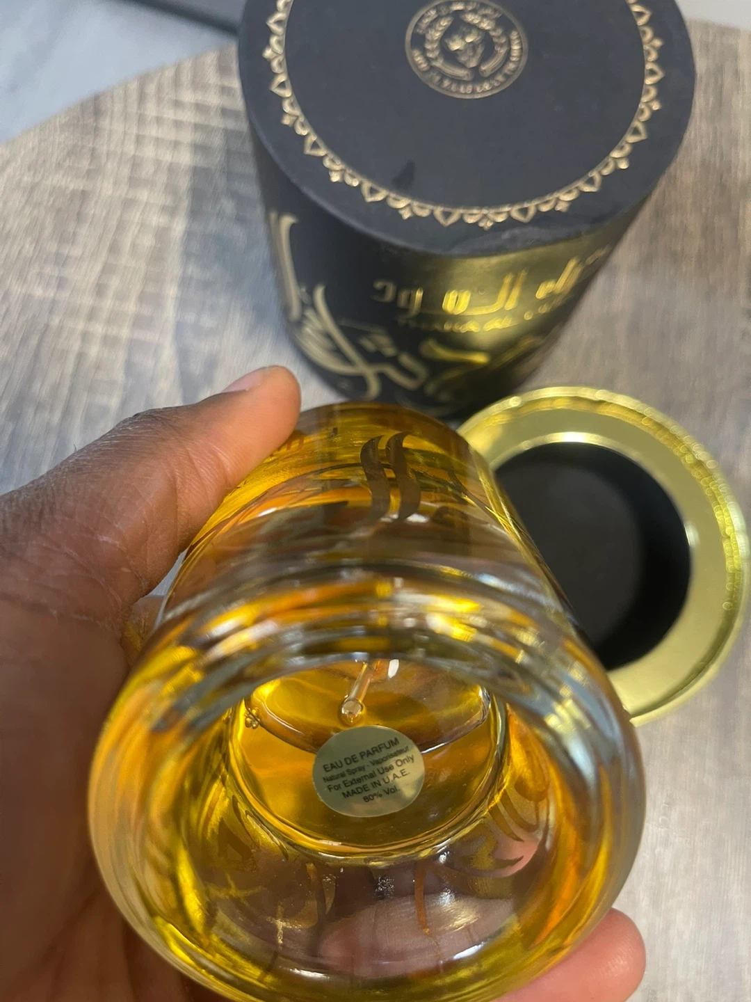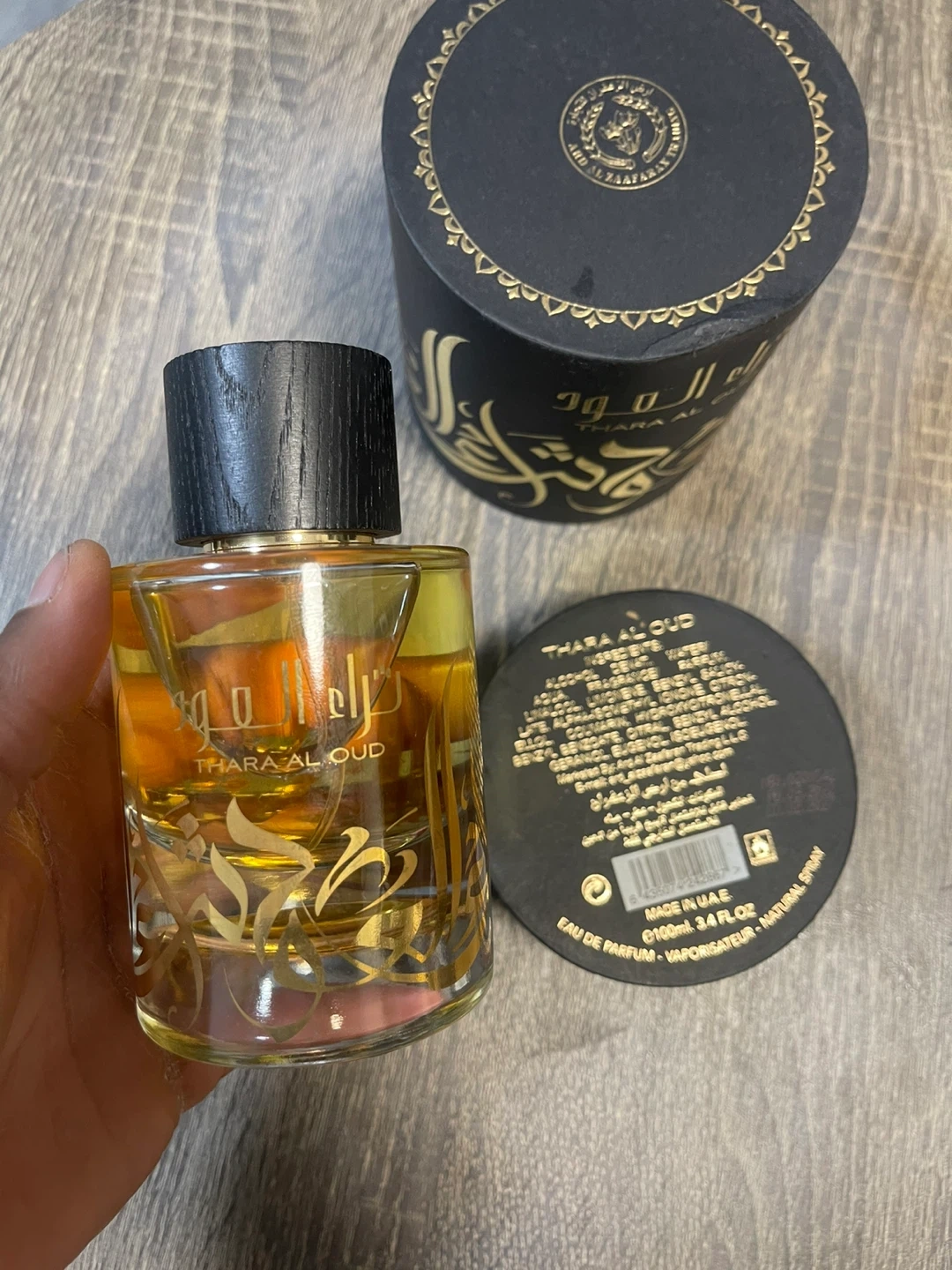 This is Thara Al Oud Eau de Parfum, a captivating scent presented in a 100ml bottle. It's an eau de parfum for men and women, offering a rich fragrance experience. The bottle comes with its original packaging. Got from my last trip to Dubai. Brand new, 100% full.
