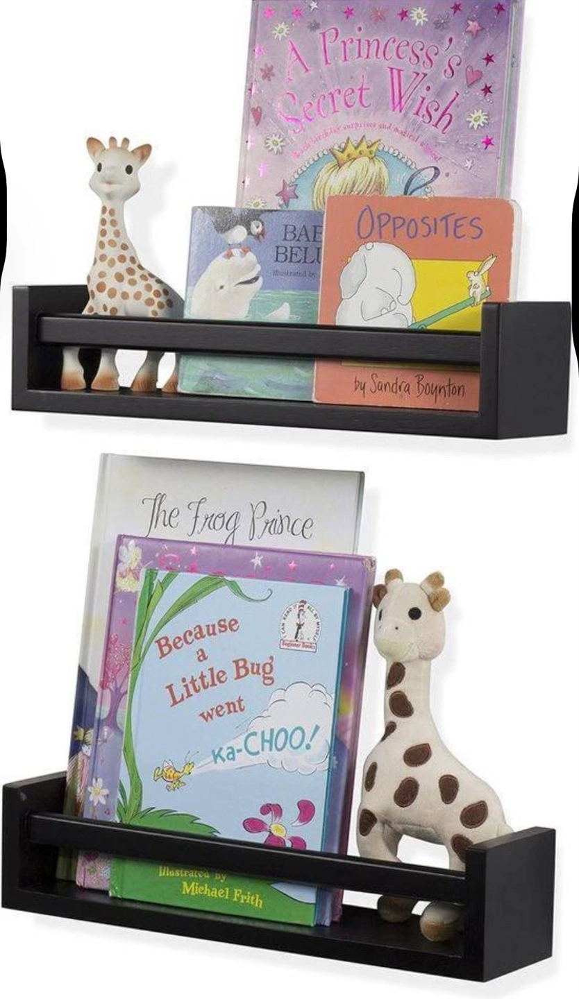 Adorable set of two small floating shelves. Perfect for a child's room or small space. Black finish. Measures approximately 15.7" wide x 4" high x 3.6" deep. Sturdy construction. Easy to install. Great for displaying books, toys, or small decor.