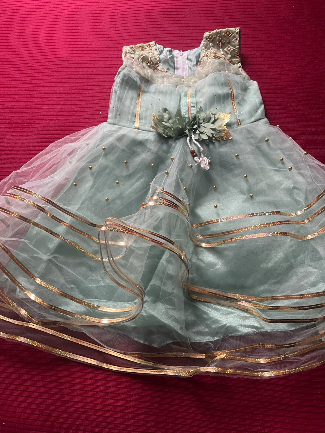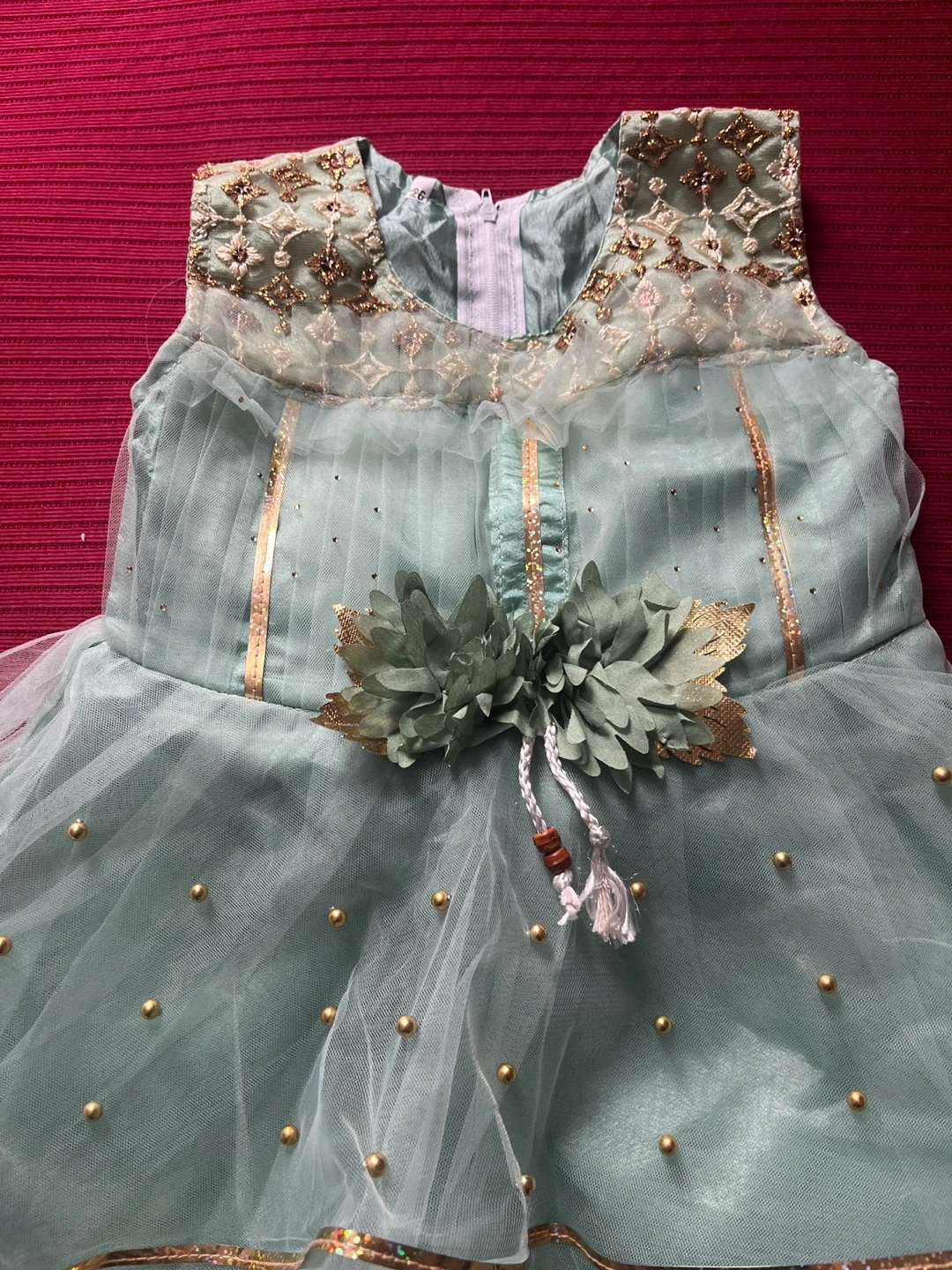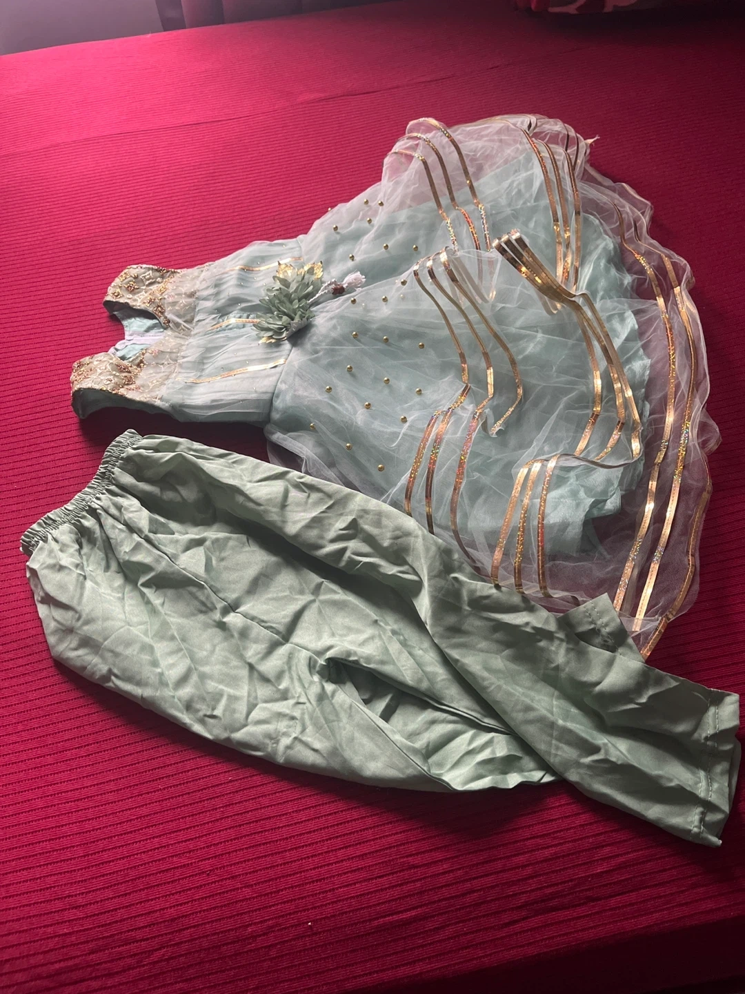 This is a lovely mint green sleeveless dress with delicate gold trim and embellishments. It comes with a matching pair of pale green pants. Perfect for special occasions!