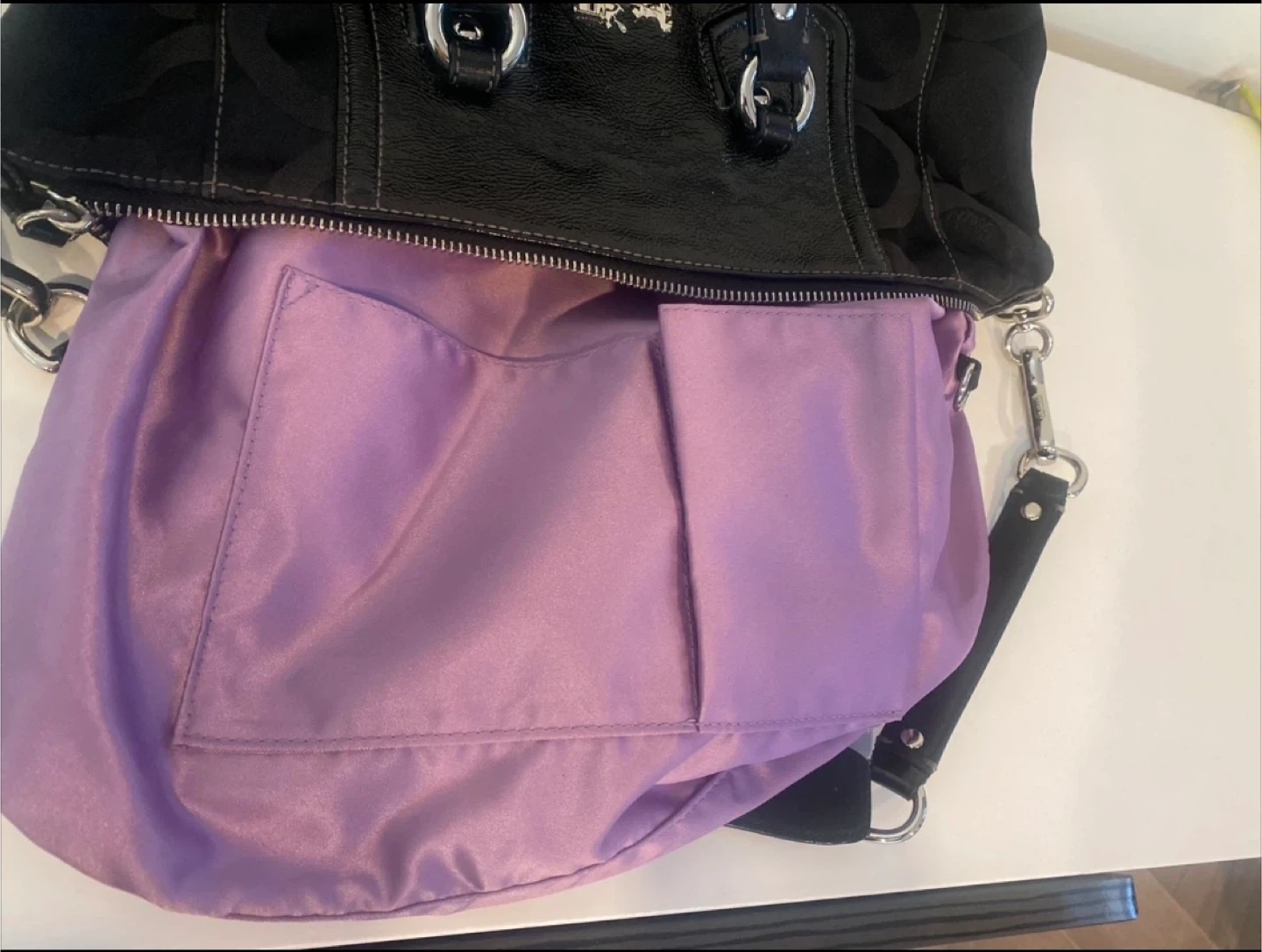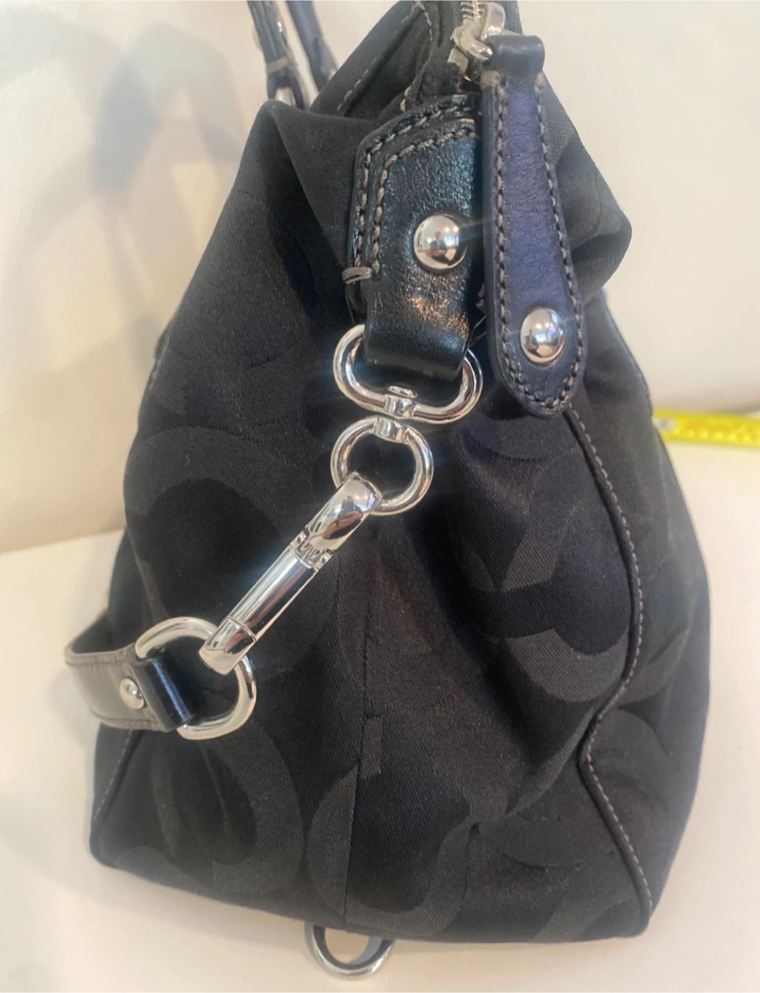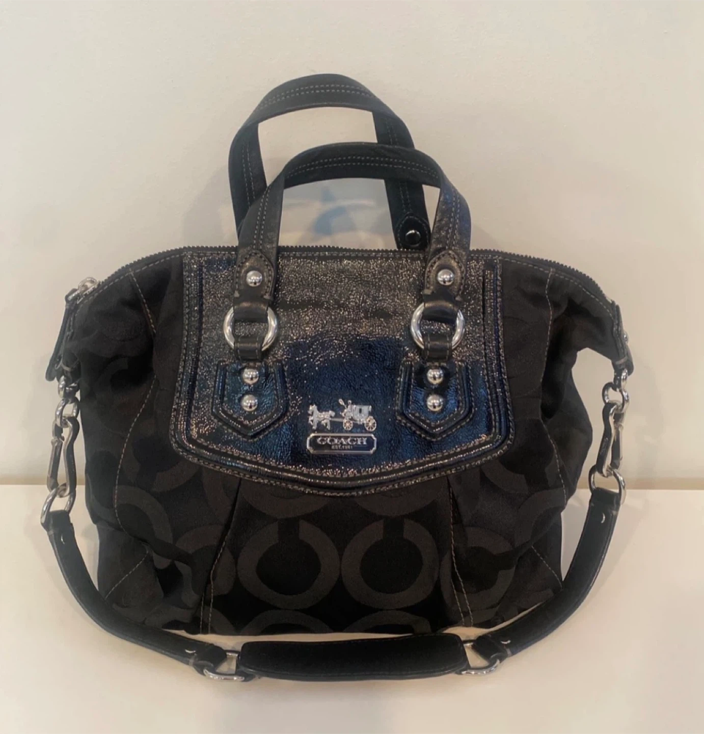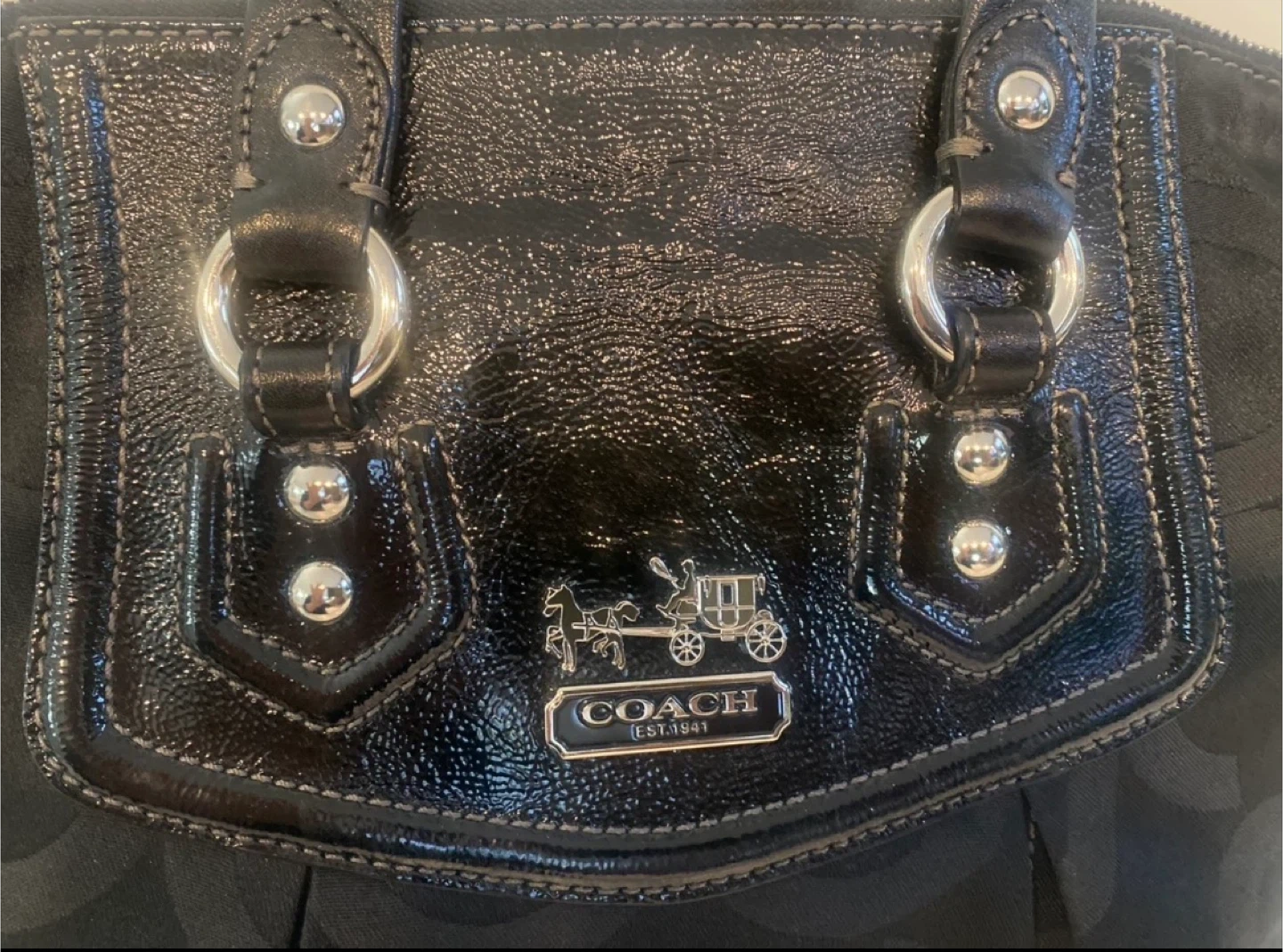 This is a black Coach Purse with the signature C monogram pattern. It features patent leather trim and silver-tone hardware. It has both top handles and a detachable shoulder strap for versatility.
