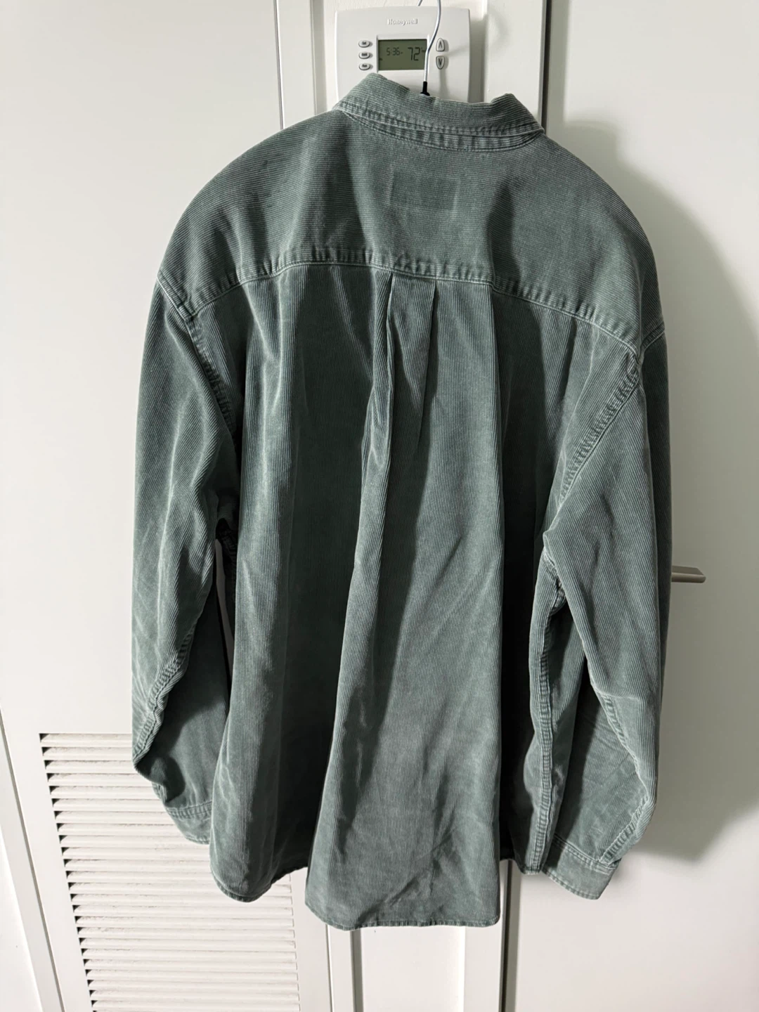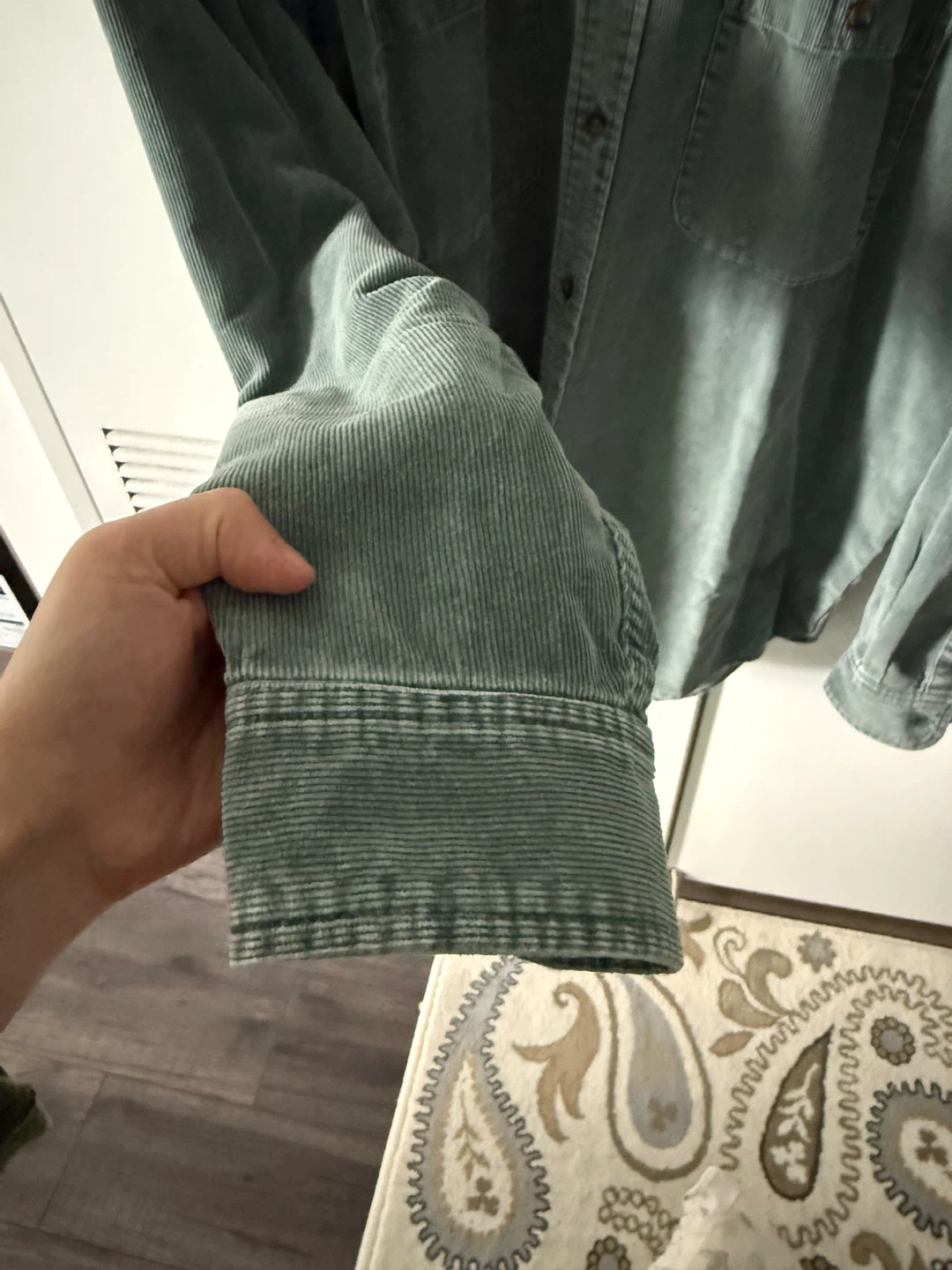 Green corduroy button-up shirt by Eddie Bauer. Long sleeves with button cuffs. Two chest pockets. Size L/G.