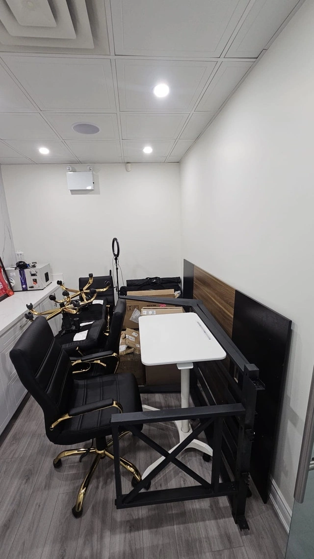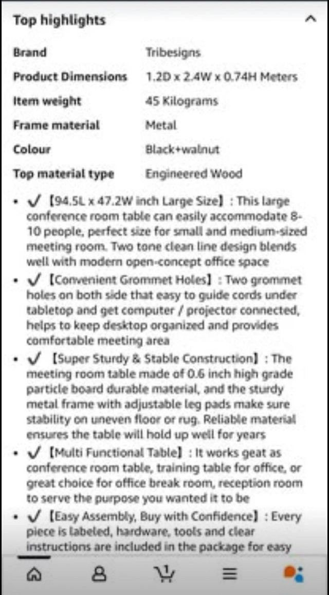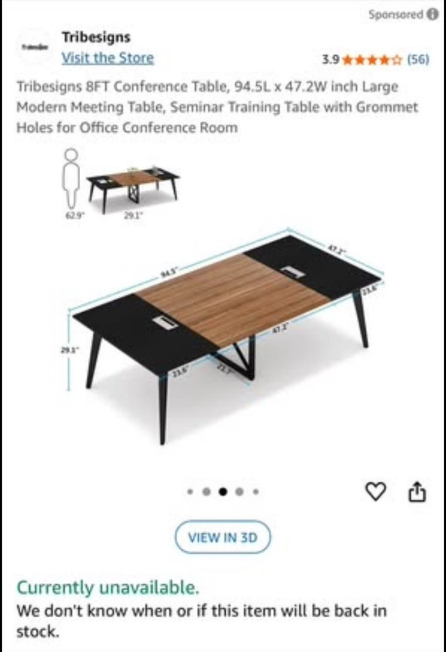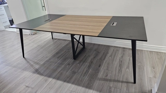 Selling a Tribesigns 8FT Conference Table, perfect for any office or meeting space, along with chairs. This table comfortably seats 8-10 people and features convenient grommet holes for cable management. The two-tone black and walnut design fits well in modern open-concept offices. The table is in good, used condition with some expected wear and tear.