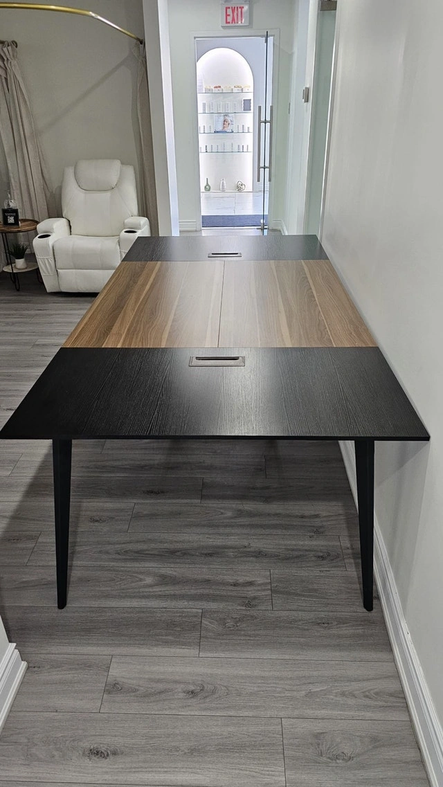 Selling a Tribesigns 8FT Conference Table, perfect for any office or meeting space, along with chairs. This table comfortably seats 8-10 people and features convenient grommet holes for cable management. The two-tone black and walnut design fits well in modern open-concept offices. The table is in good, used condition with some expected wear and tear.