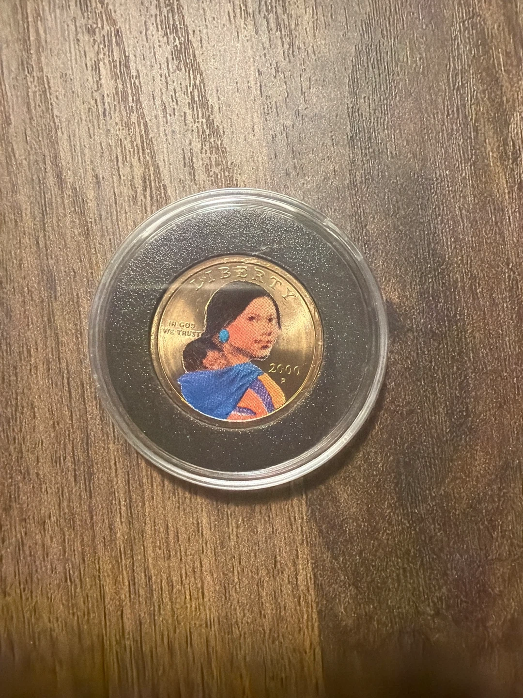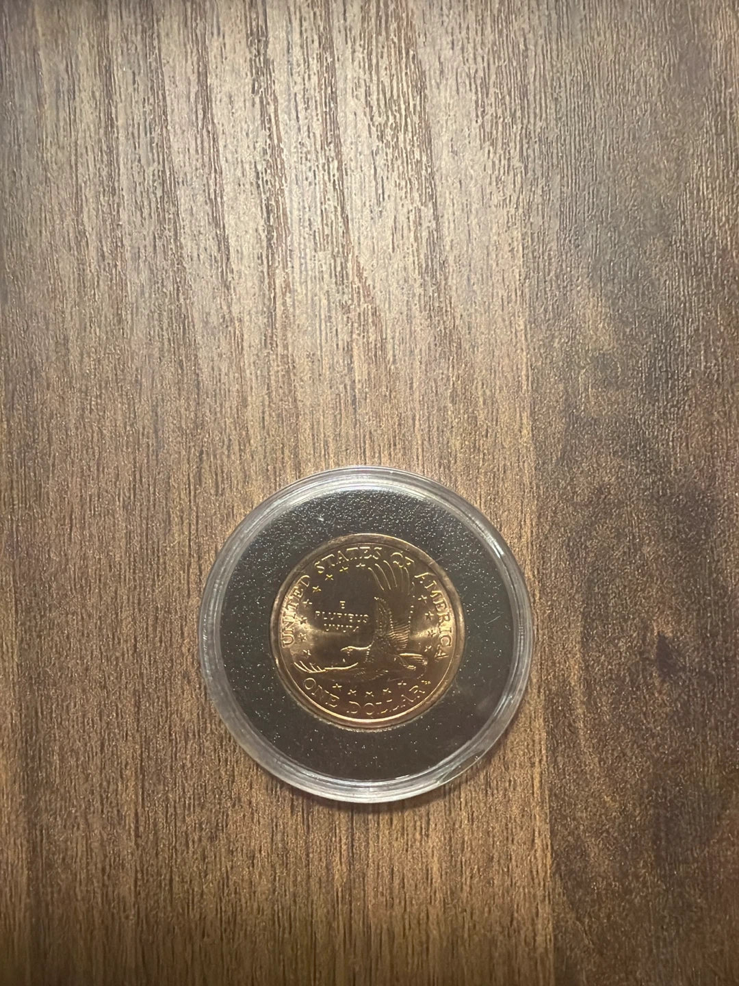 This is a 2000 Sacagawea dollar coin. The obverse features Sacagawea. The reverse depicts a bald eagle in flight. In a protective case uncirculated Grade MS 65 mint.