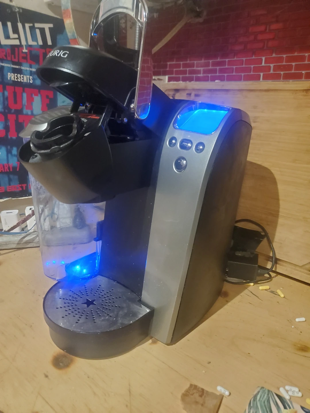 It's a Keurig single-serve coffee maker with a removable water reservoir. Brews your favourite coffees and teas quickly. Comes with one K-Cup coffee pod.