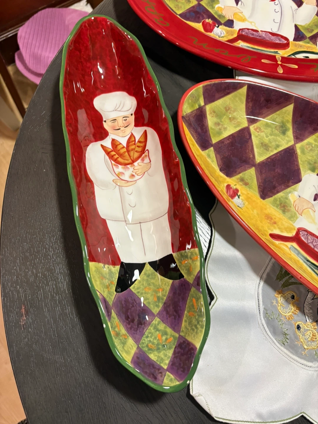 This decorative platter features a chef design. It's perfect for serving appetizers or as a centrepiece. Ceramic material.