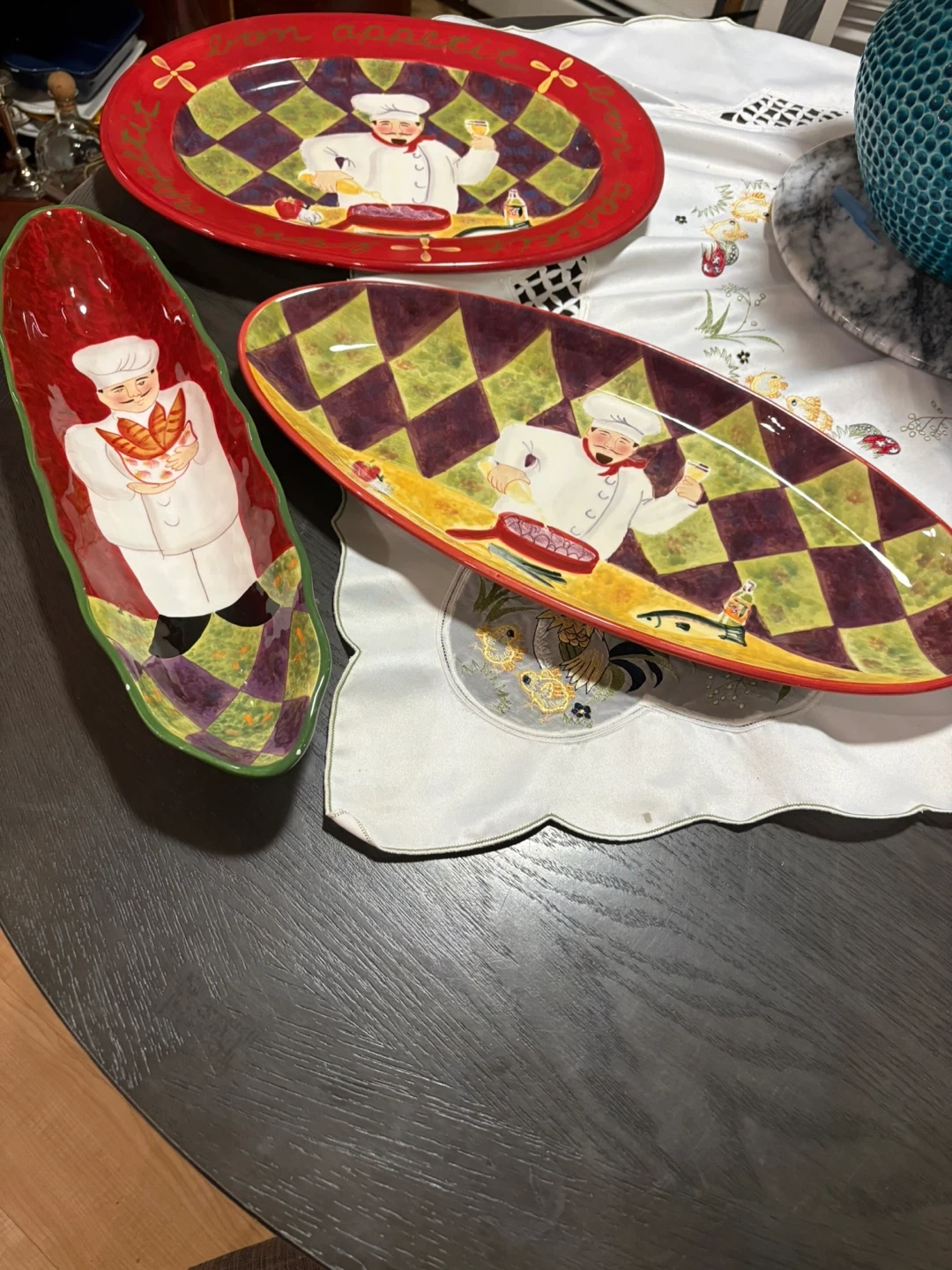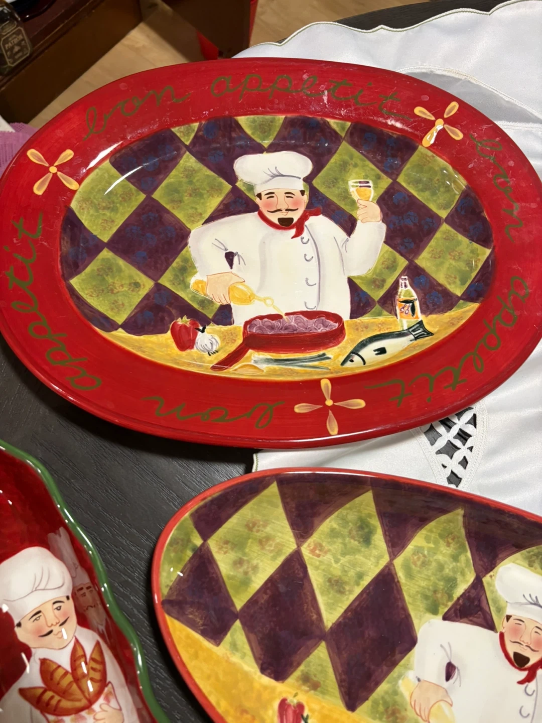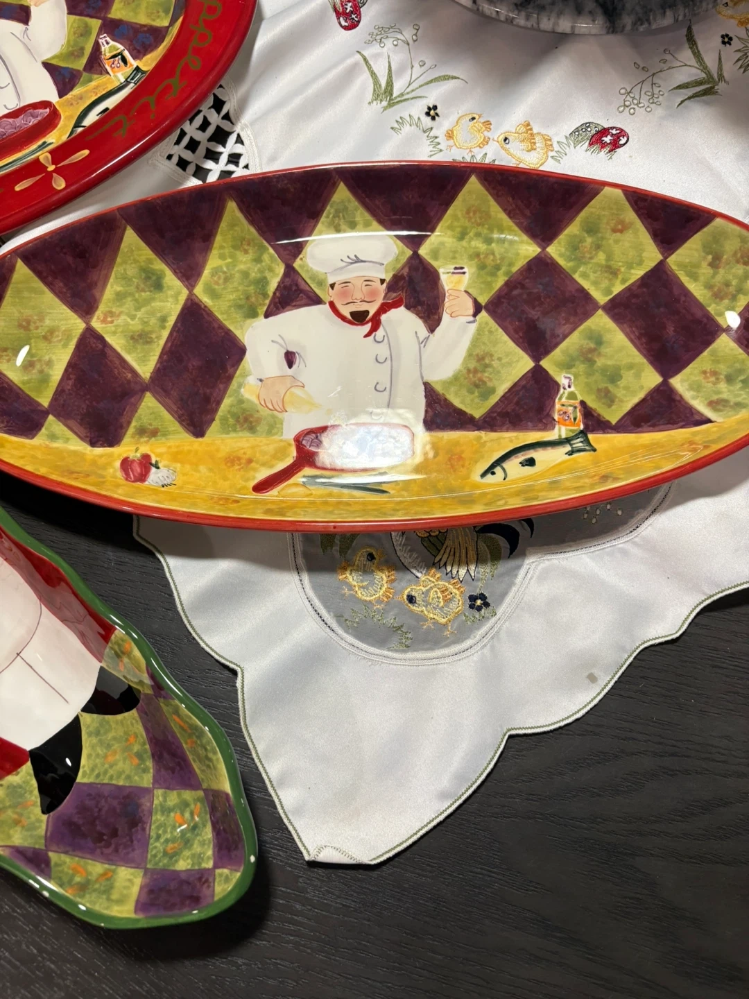 This decorative platter features a chef design. It's perfect for serving appetizers or as a centrepiece. Ceramic material.