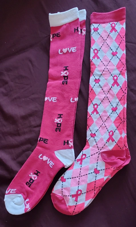 Pair of pink knee-high socks. One features a repeating pattern of 'Hope', 'Love', and pink ribbons. The other features a pink and white argyle pattern with pink ribbons. Soft and comfortable.