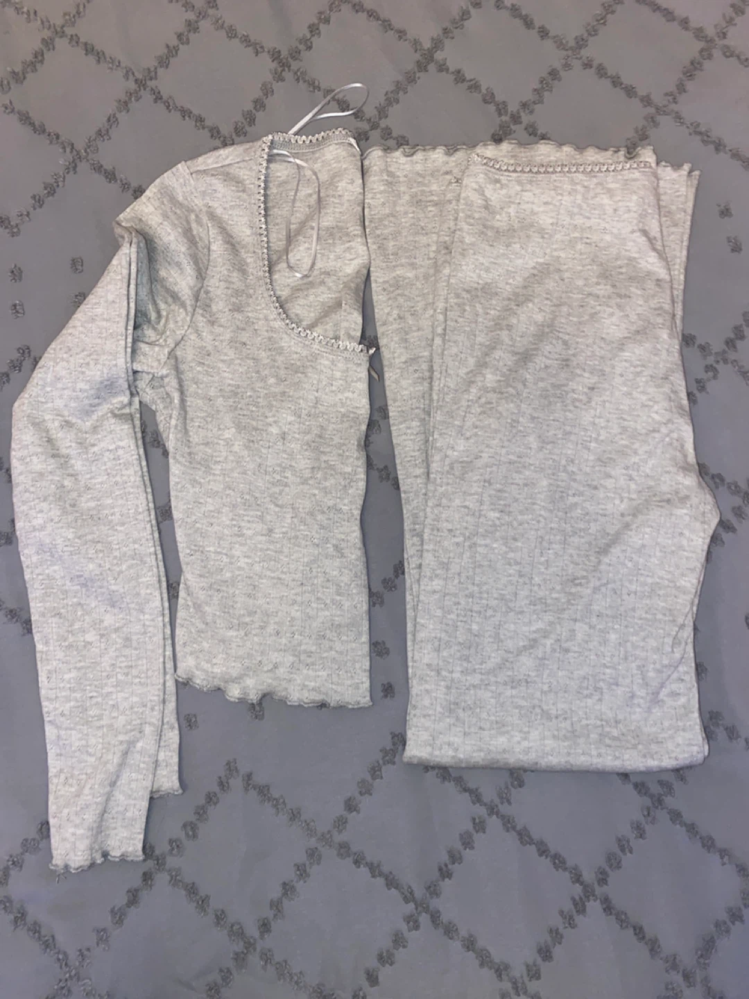 Selling a cute grey long sleeve top and pants set. It's in great condition and super comfy for lounging around the house or running errands!