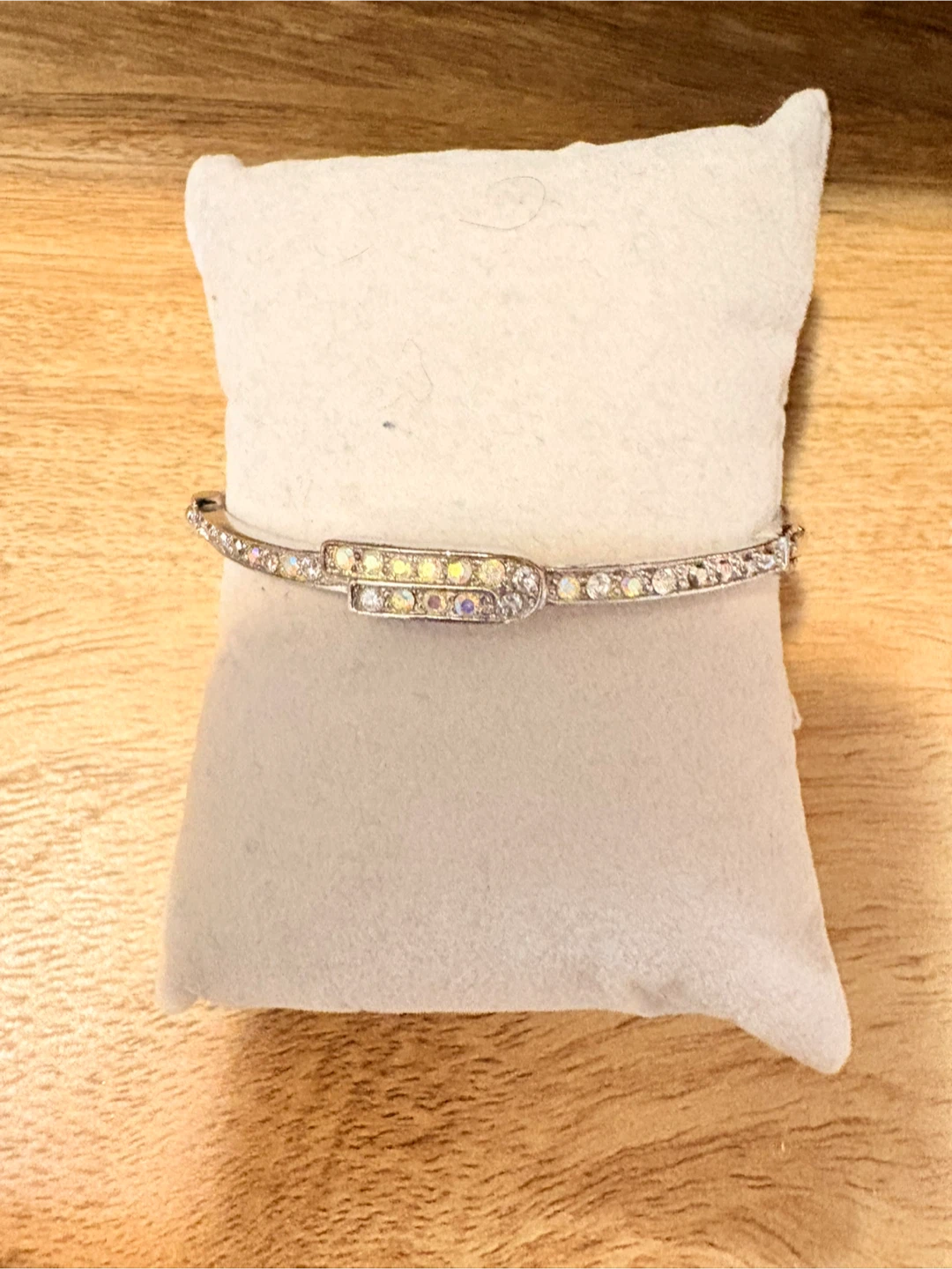 Beautiful silver bangle bracelet adorned with clear and iridescent stones. It features a secure clasp closure. This bracelet adds a touch of sparkle to any outfit!