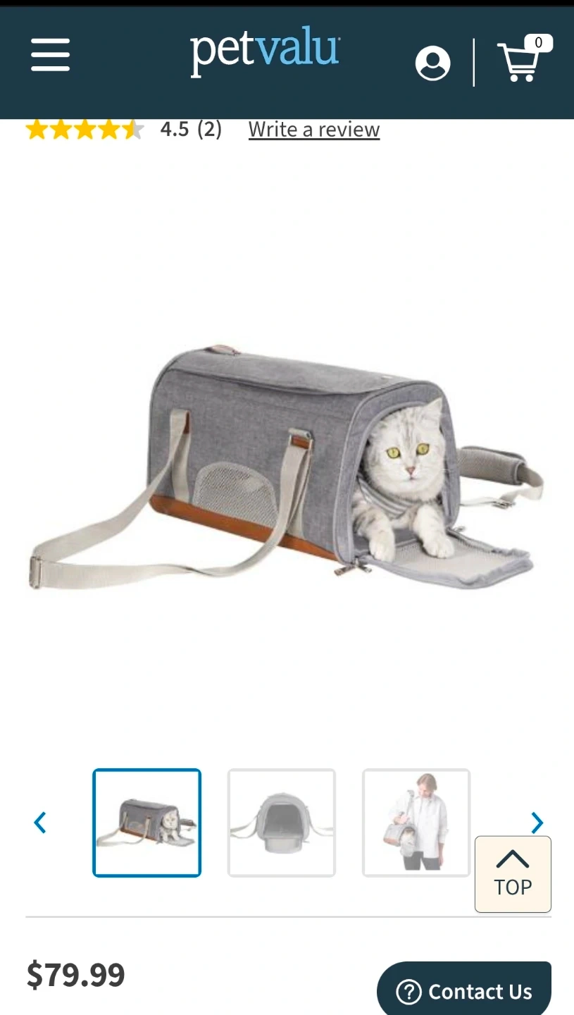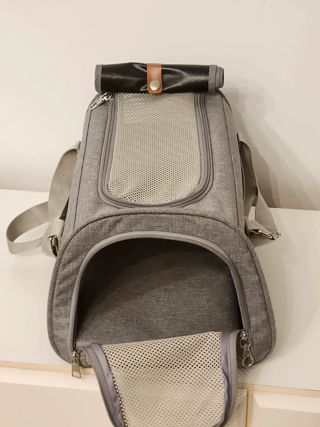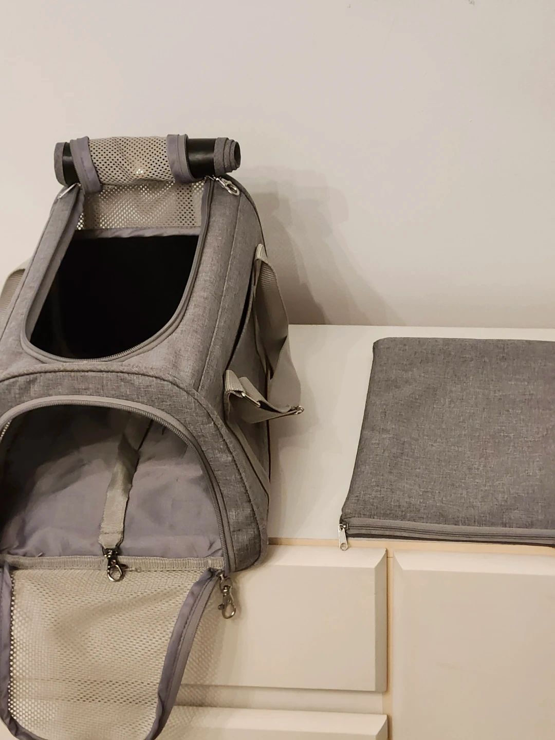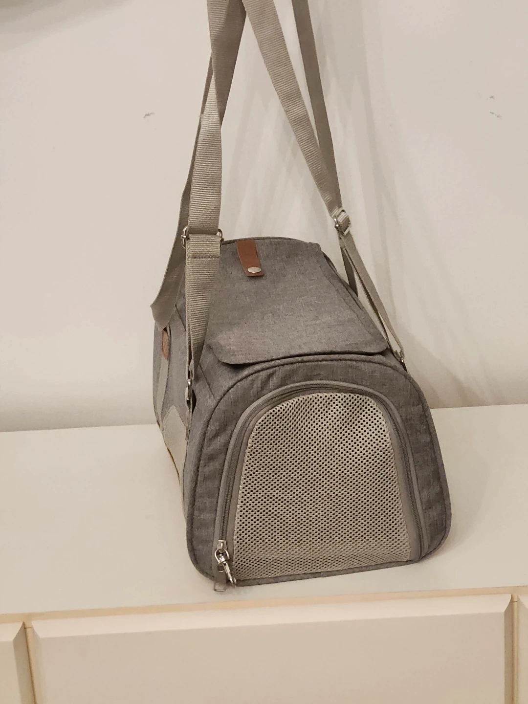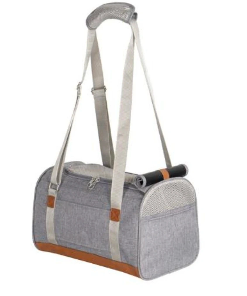 This item is a Bailey & Bella Jet Setter Grey Soft Carrier, designed for transporting small pets with features like mesh ventilation and a trolley strap for luggage. It comes with a removable padded bottom and has top and side access zippers, plus a convenient shoulder strap for easy carrying. It's from Pet Valu 79.99+ tax