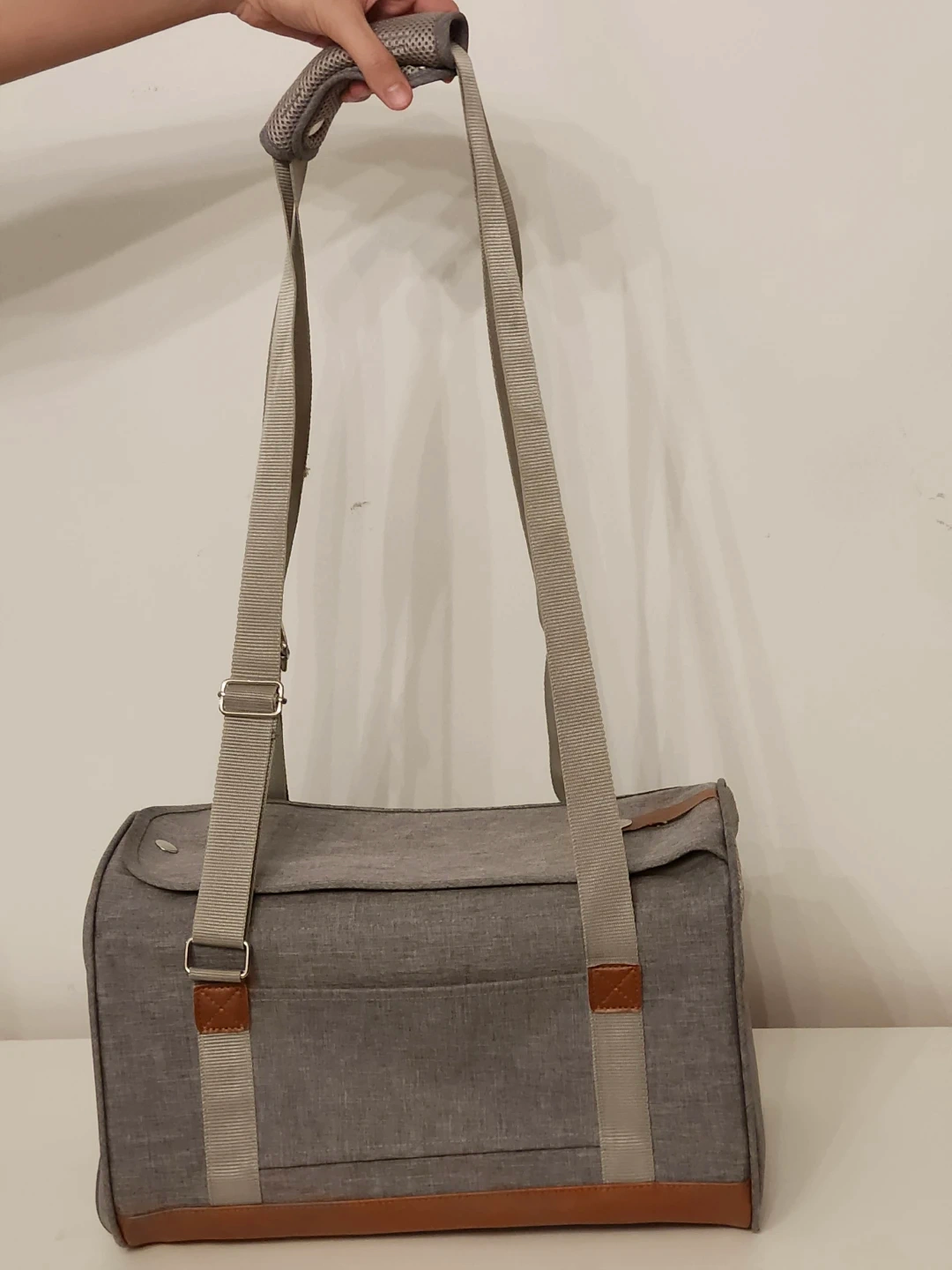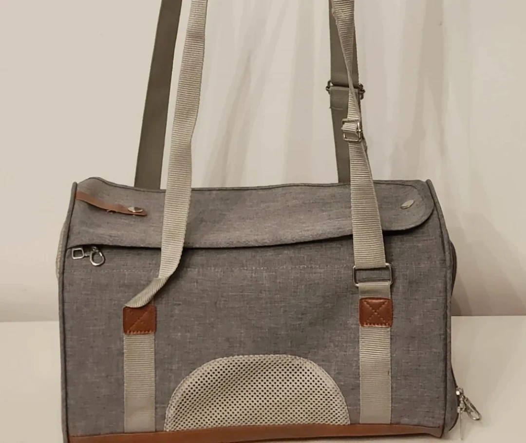 This item is a Bailey & Bella Jet Setter Grey Soft Carrier, designed for transporting small pets with features like mesh ventilation and a trolley strap for luggage. It comes with a removable padded bottom and has top and side access zippers, plus a convenient shoulder strap for easy carrying. It's from Pet Valu 79.99+ tax