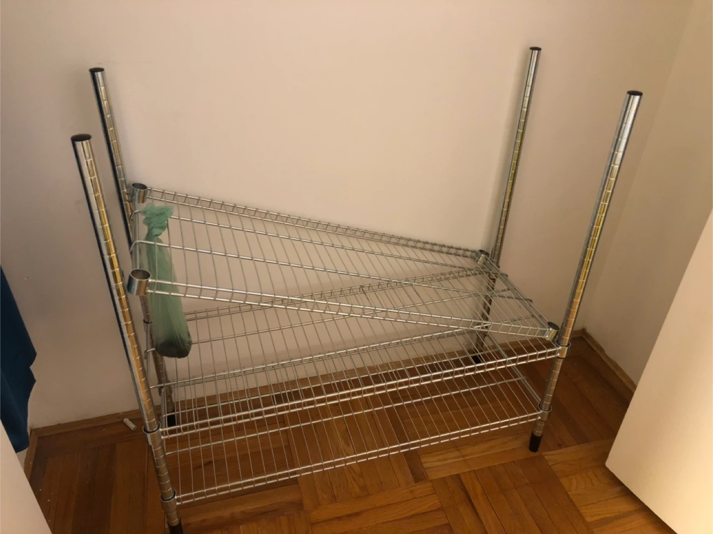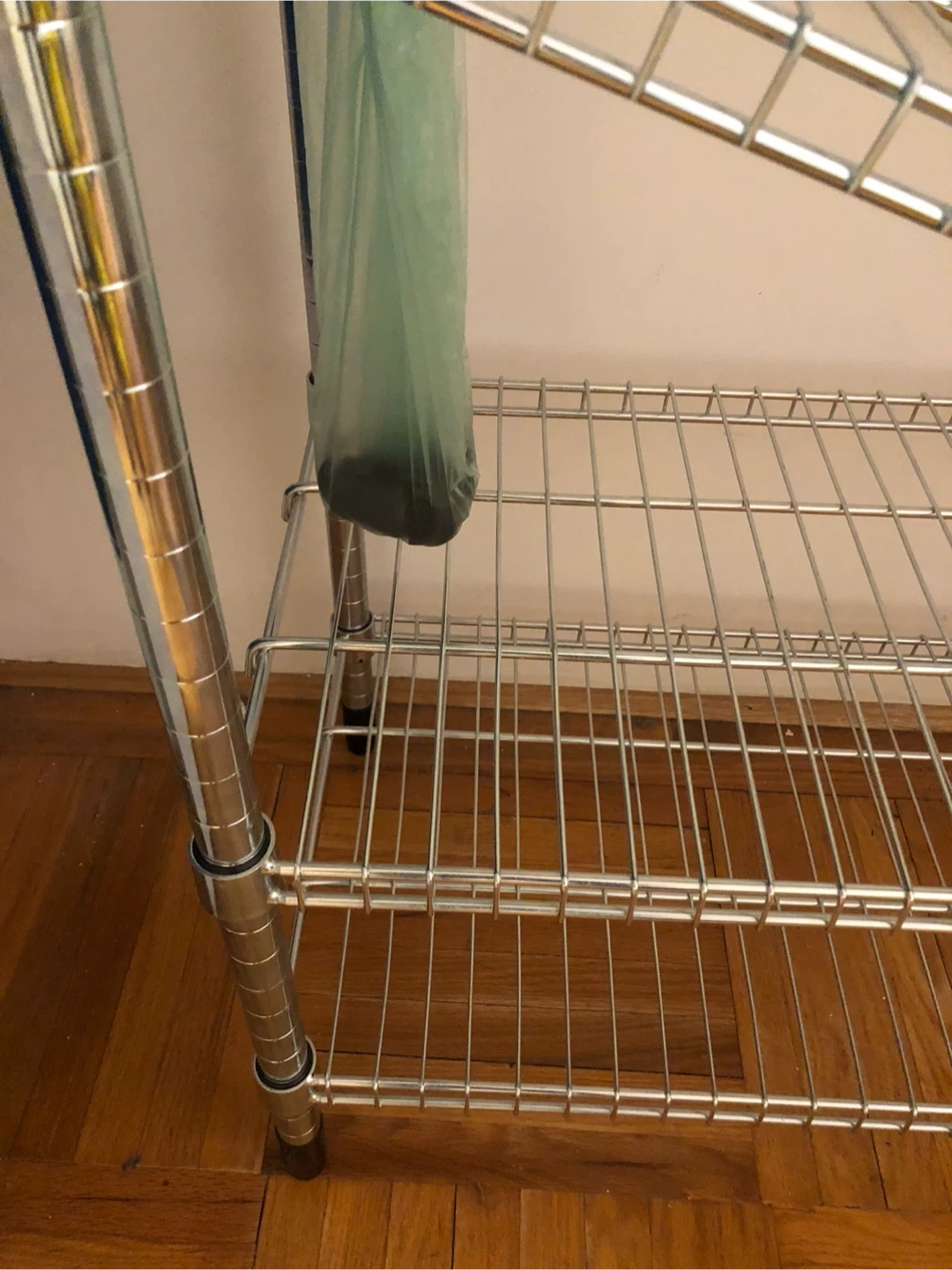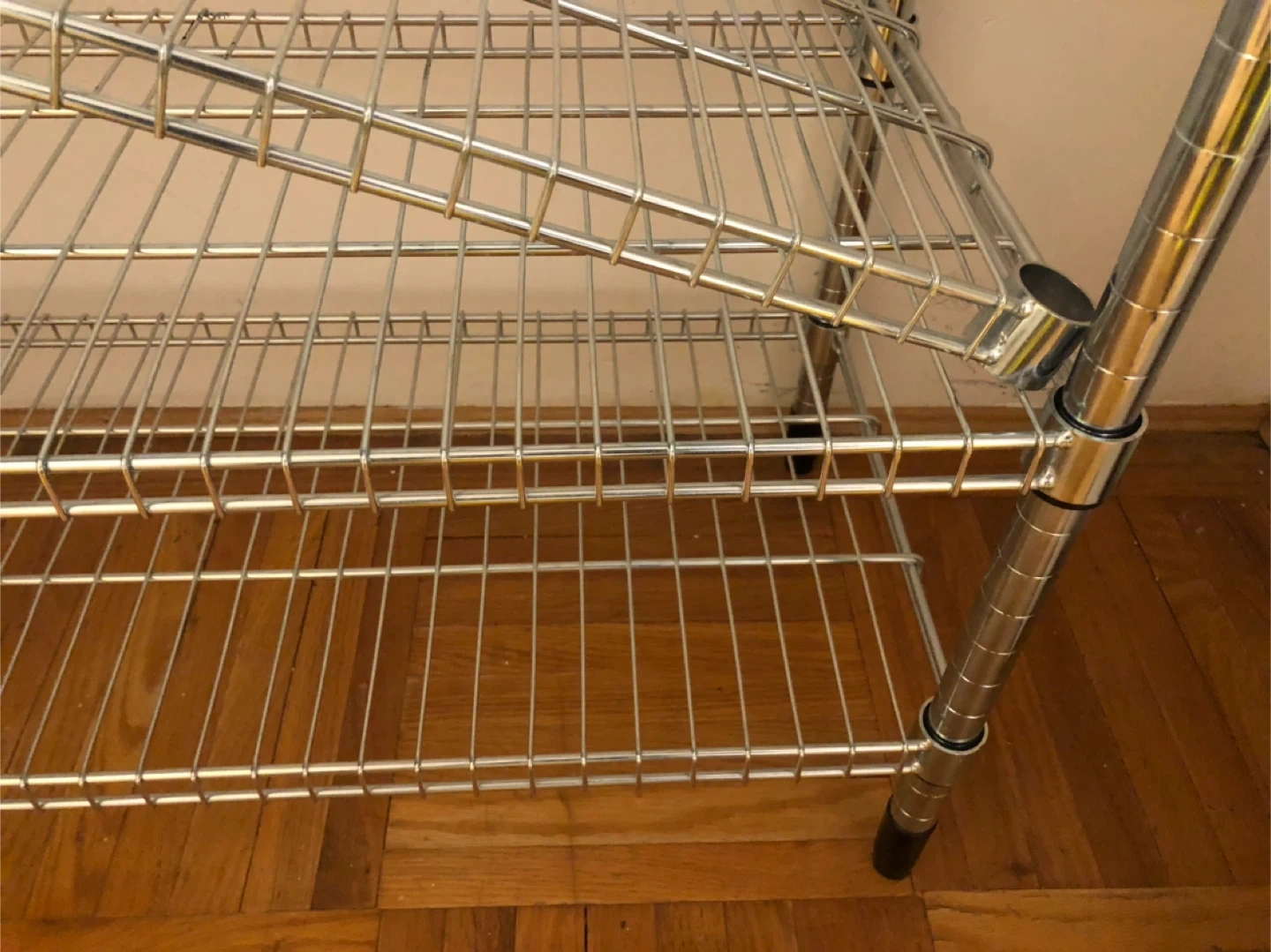 This is a metal shelving unit with three shelves. It's made of metal and has a shiny chrome finish. This shelving unit is great for organizing your home or garage!