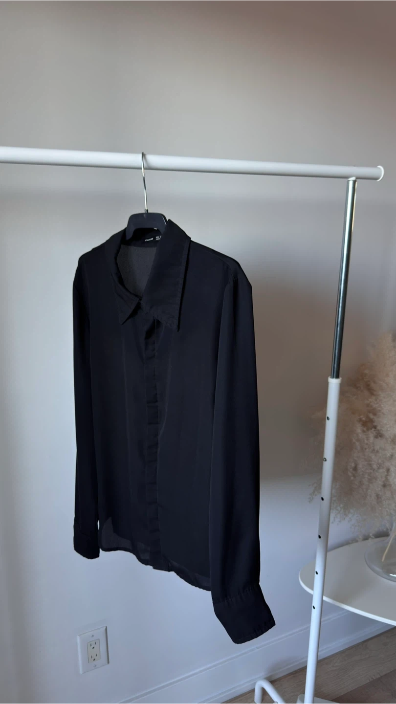 Black collared blouse from SHEIN. It's made of a lightweight fabric with long sleeves. This blouse is perfect for layering or wearing on its own for a smart casual look.