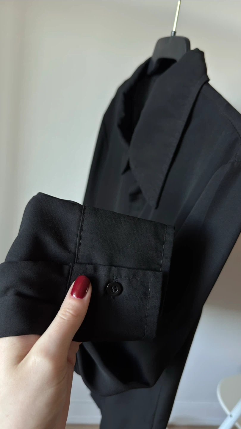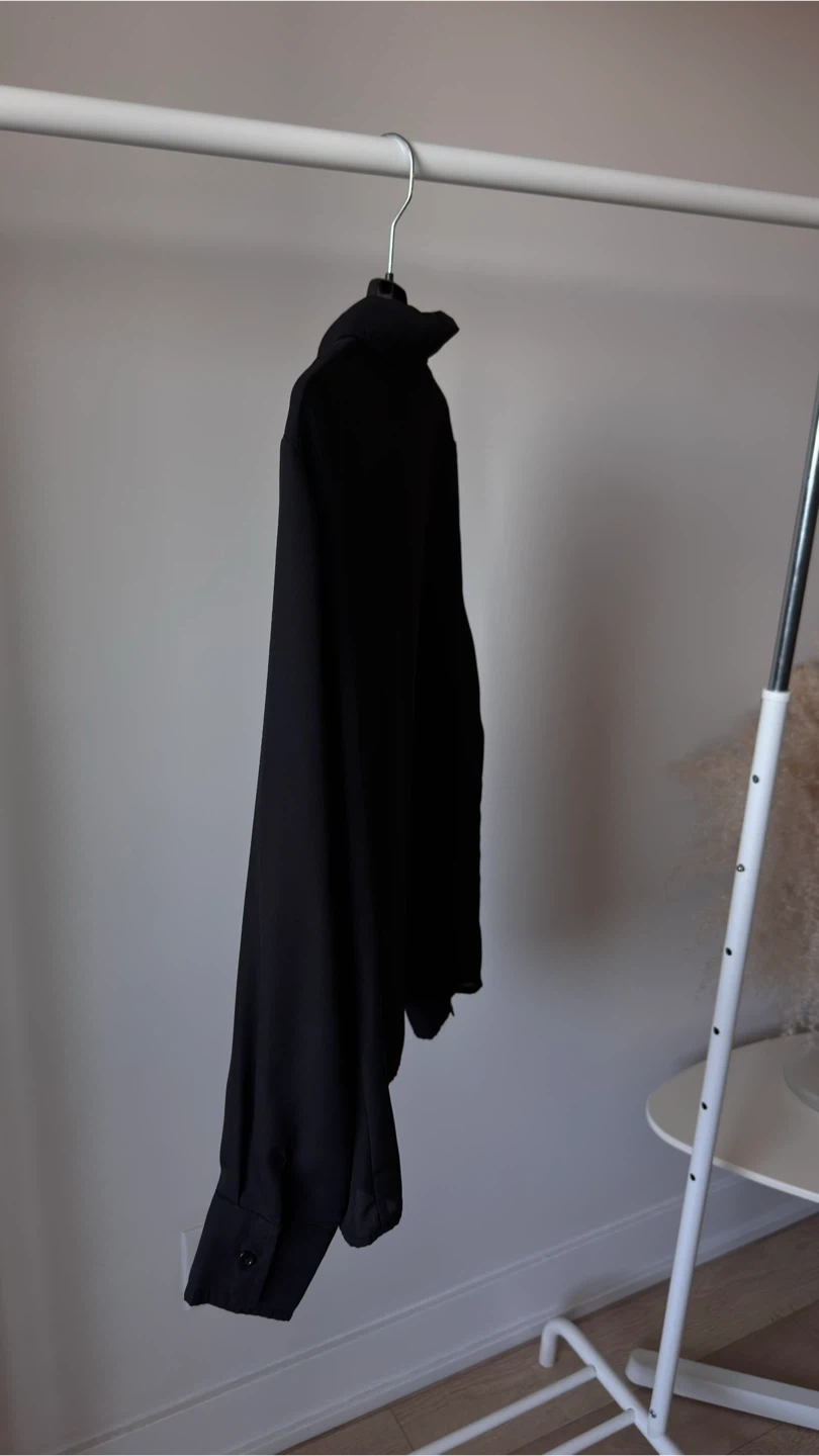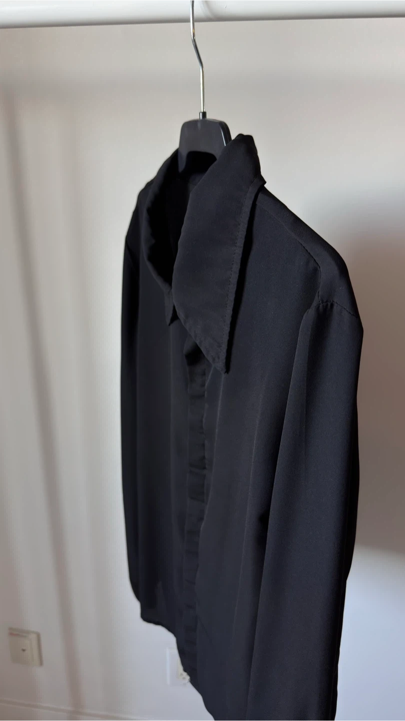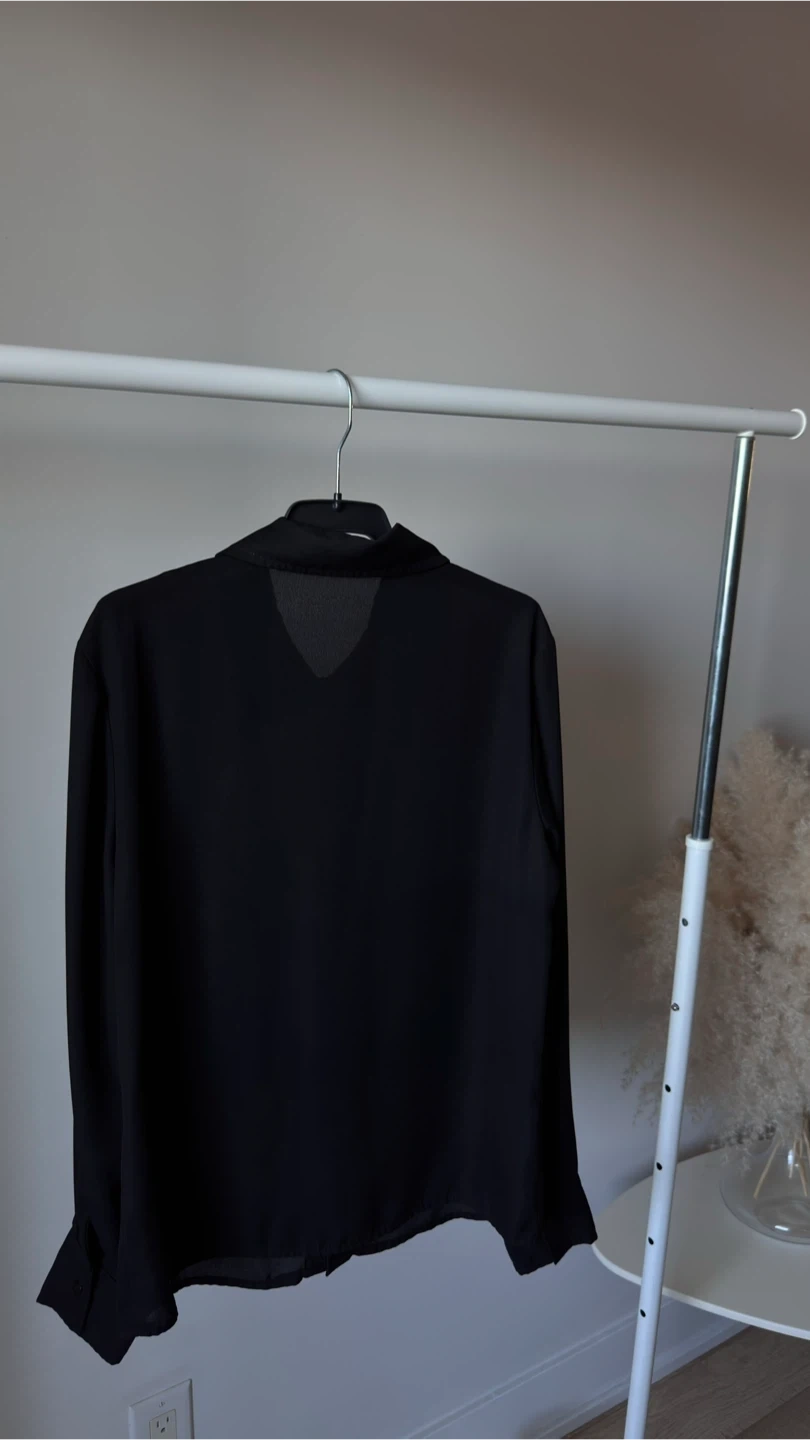 Black collared blouse from SHEIN. It's made of a lightweight fabric with long sleeves. This blouse is perfect for layering or wearing on its own for a smart casual look.