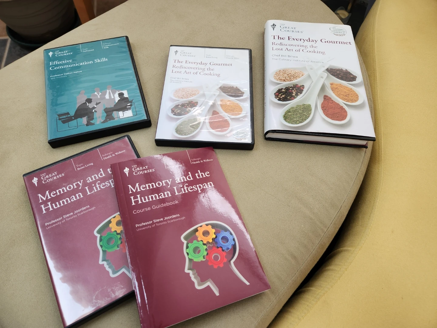 This set includes the 'Memory and the Human Lifespan' Course Guidebook and a DVD from The Great Courses. The guidebook is by Professor Steve Joordens. Also included is 'Effective Communication Skills' DVD. The 'Everyday Gourmet' book is also part of this collection.