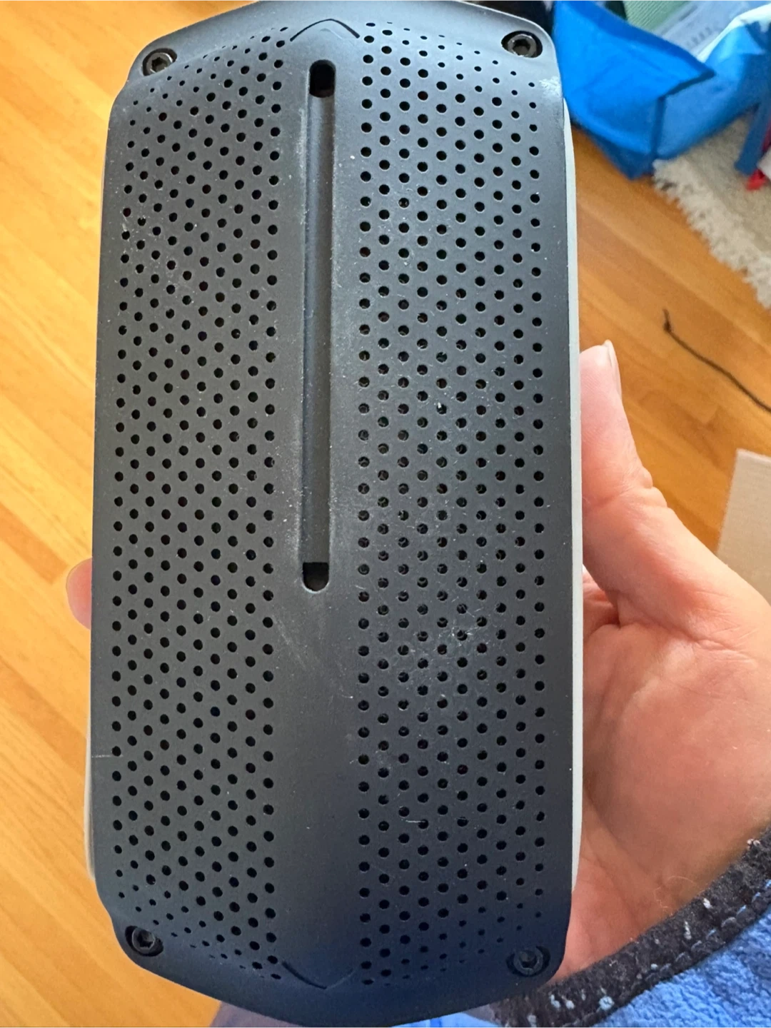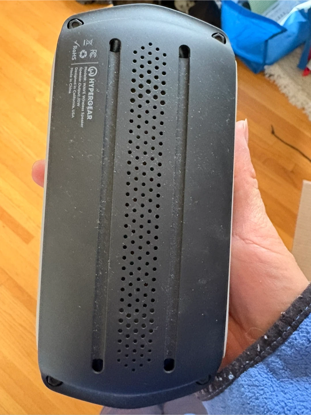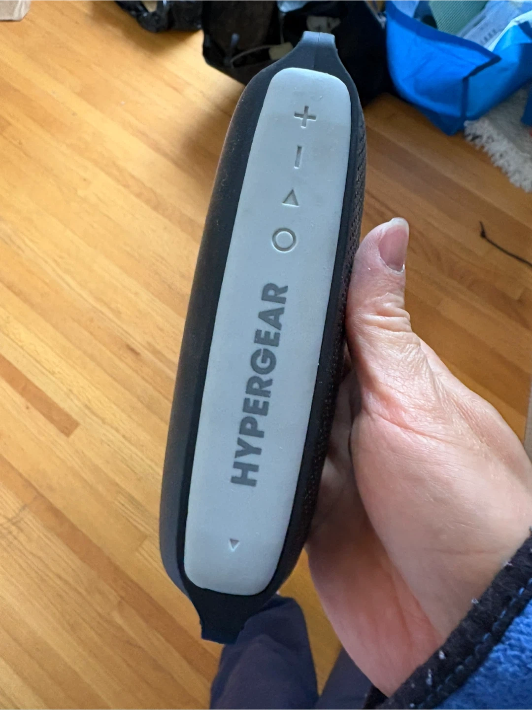 This is a HyperGear wireless speaker. It's black and grey with volume and play/pause controls on top. This speaker is great for listening to music anywhere!