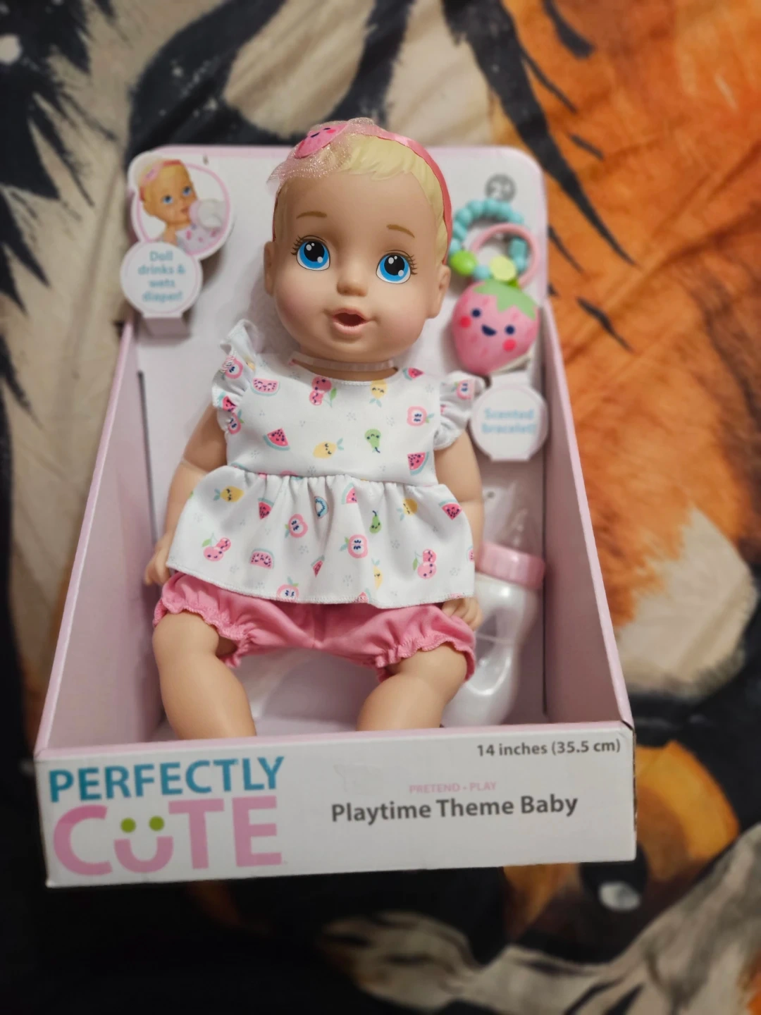 This is a Perfectly Cute Playtime Theme Baby doll that's in great condition! Includes the doll, 2-piece outfit, headband, diaper, bracelet, and milk bottle. The box says it's 14 inches (35.5 cm). This doll drinks and wets its diaper!